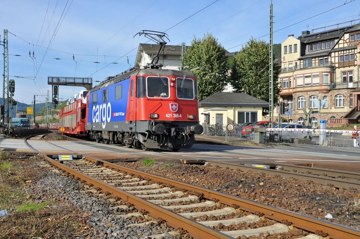 421 386 der SBB Cargo mit einem Autozug Richtung Süden auf der rechten Rheinstrecke.Bild entstand im Bahnhof Rüdesheim am Rhein am 3.10.2013 Daniel Powalka