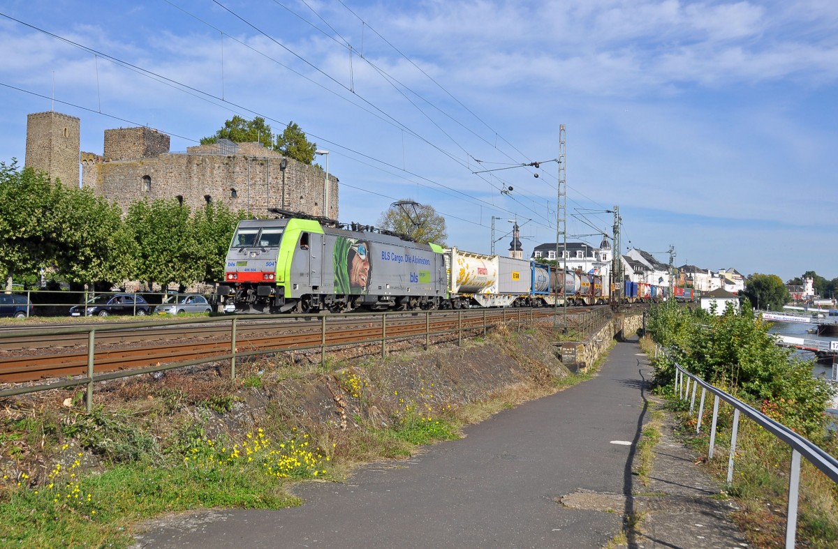 486 504 der BLS Cargo"Die Alpinisten" mit einem KLV-Zug in Richtung Norden auf der rechten Rheinseite.Aufgenommen bei strahlemden Sonnenschein im Bahnhof Rüdesheim am Rhein am 3.10.2013. Daniel Powalka