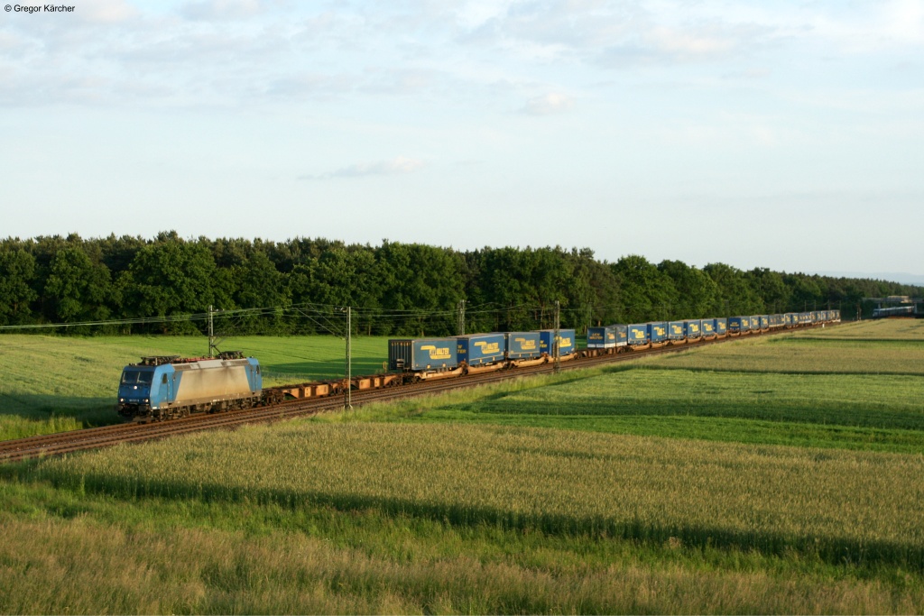 182 572 mit dem CNL 472 Basel-Kopenhagen im letzten Abendlicht bei Graben-Neudorf. Aufgenommen am 04.06.2013. Der Kurswagen nach Moskau, der sich normalerweise hinter der Lok befindet, fiel an diesem Tag aus. Gregor Kaercher