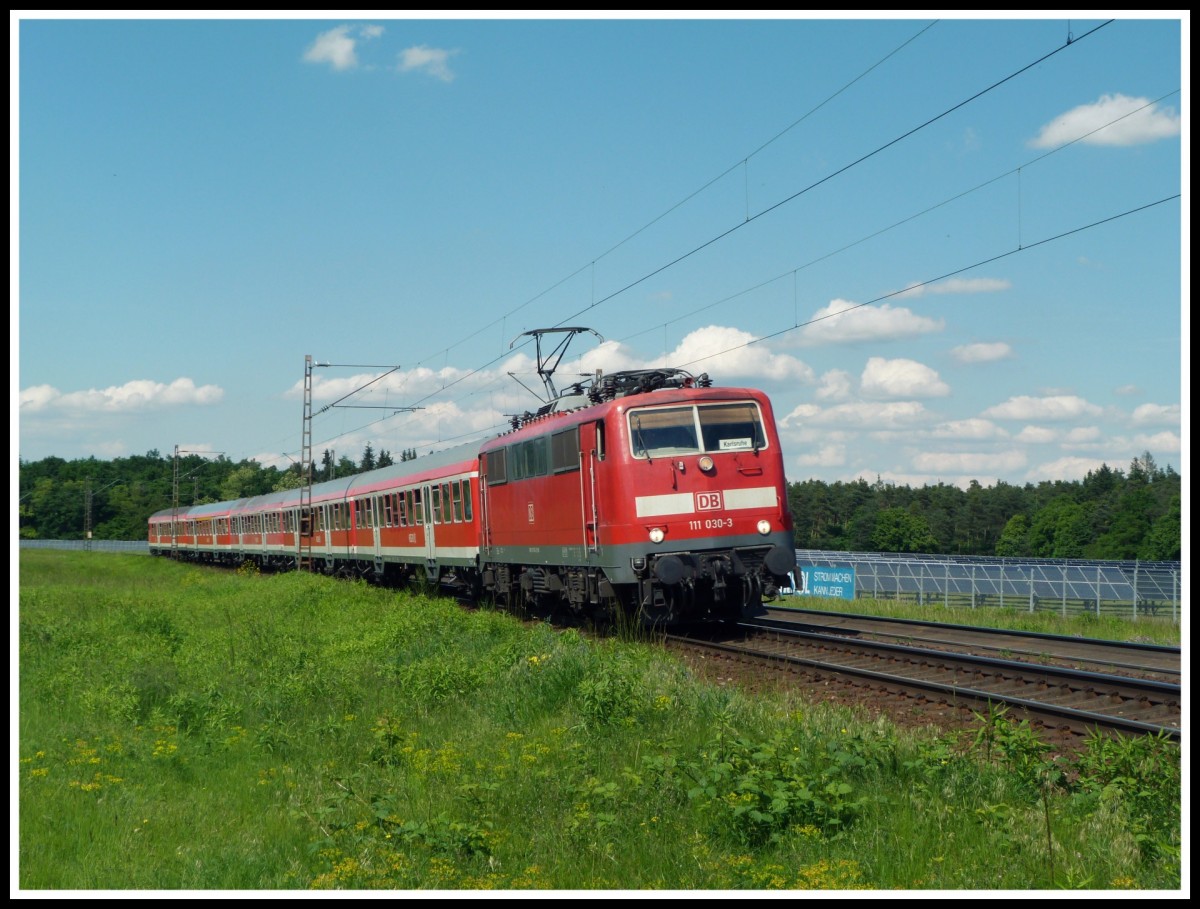111 030 fährt am 27.5.13 mit einer n-Wagengarnitur über die Rheinbahn von Mannheim nach Karlsruhe.