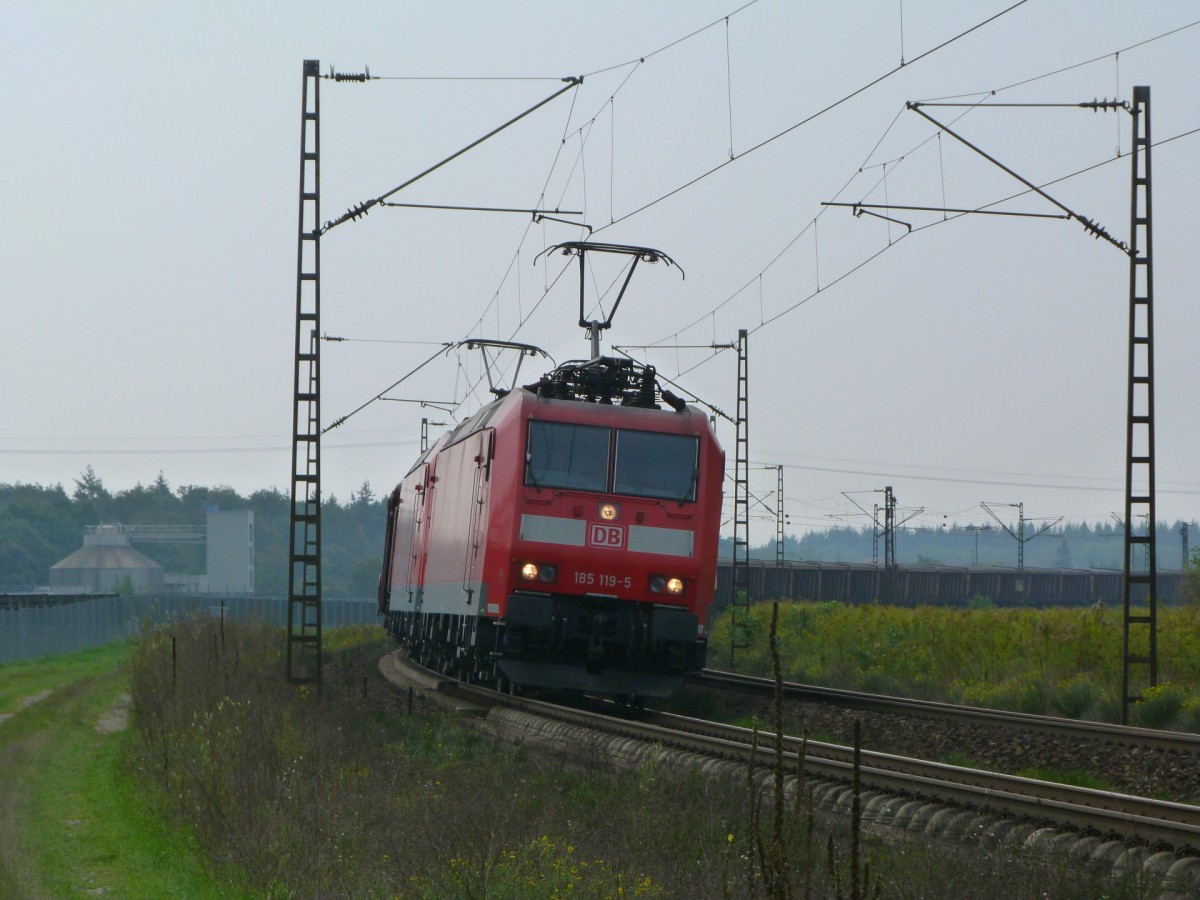 185 119 und eine weitere 185 ziehen am 28.8.13 einen Güterzug über die Rheinbahn, Richtung Mannheim.