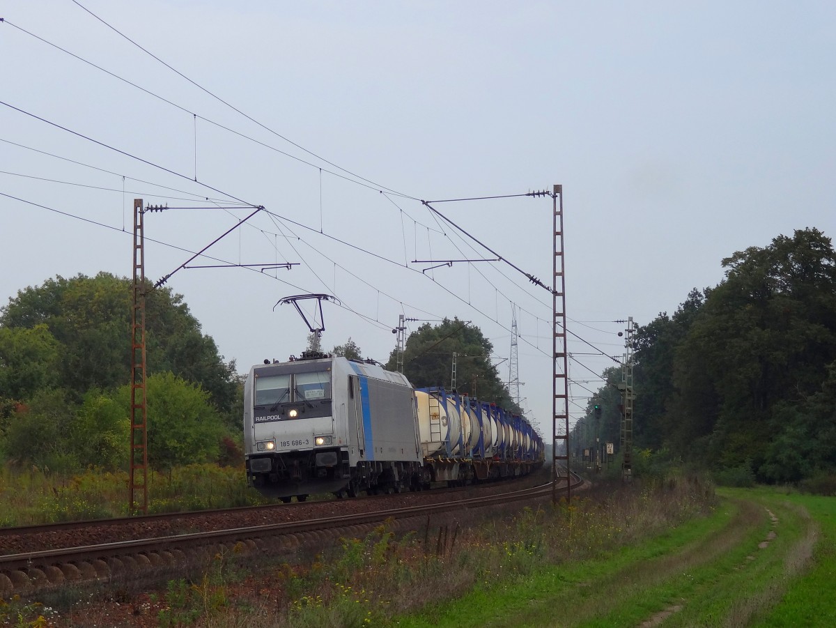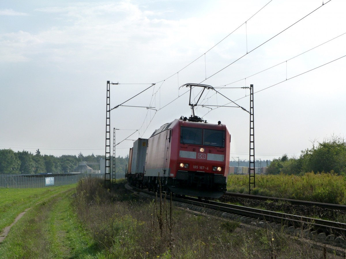 185 601 zieht am 28.9.13 einen Zug des Kombinierten Ladungsverkehr (KLV) über die Rheinbahn Richtung Mannheim.