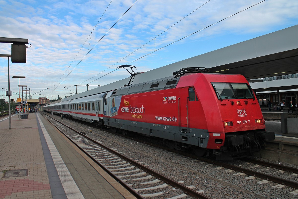 Am 02.09.2013 bespannte 101 109-7 "Cewe Fotobuch (Kamera)" den IC 2319 von Münster (Westf.) Hbf nach Stuttgart Hbf. Hier ist der InterCity beim Zwischenhalt in Mannheim Hbf. Tobias Schmidt