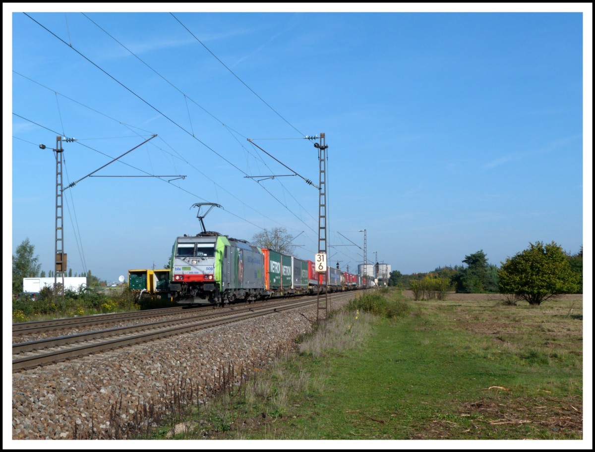 BLS 486 508 fährt am 19.10.13 mit einem KLV über die Rheinbahn von Mannhem Richtung Karlsruhe.