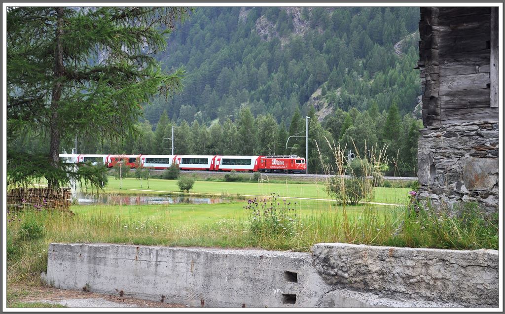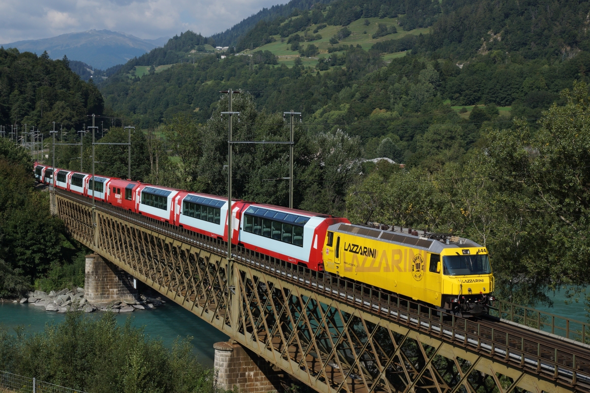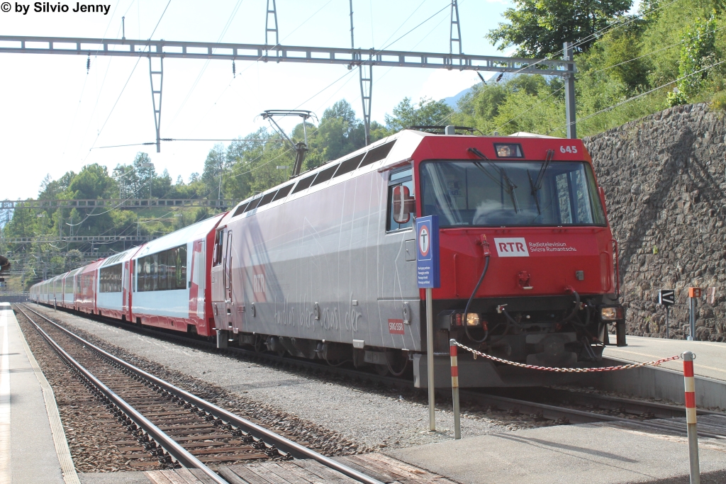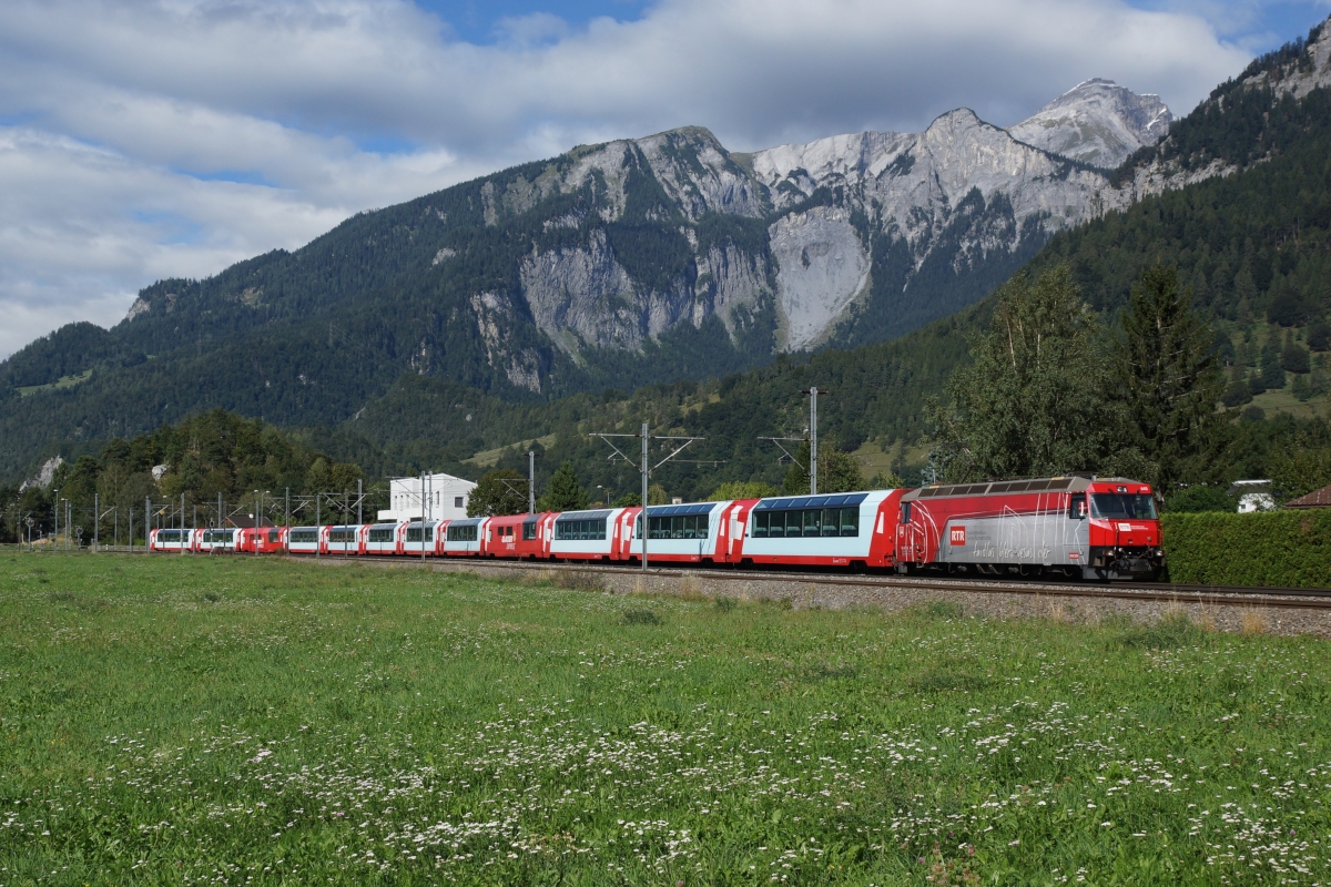 Die meiner Meinung nach etwas zu grell geratene Ge 4/4 III 644 erreicht am 31.08.2013 mit dem doppelten Glacier-Express D 905/907 Reichenau-Tamins. Eine gewisse Zeit lang war diese Lok die einzige Ge 4/4 III, welche im normalen RhB-Anstrich verkehrte. Sandro Gadola