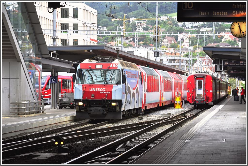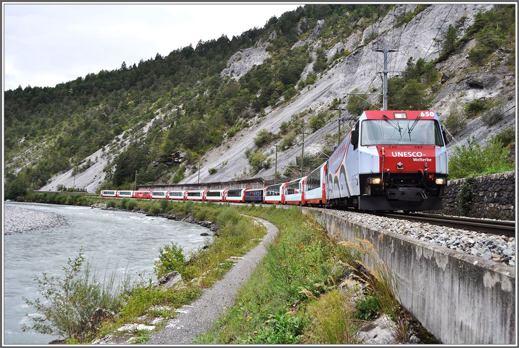 Ge 4/4 III 650 "Seewis-Valzeina" kommt von Disentis/Mustér zurück mit den GlacierExpress 902 und 904. Der stattliche Zug folgt hier dem Lauf des Vorderrheins bei Trin. (10.09.2013) Herbert Graf
