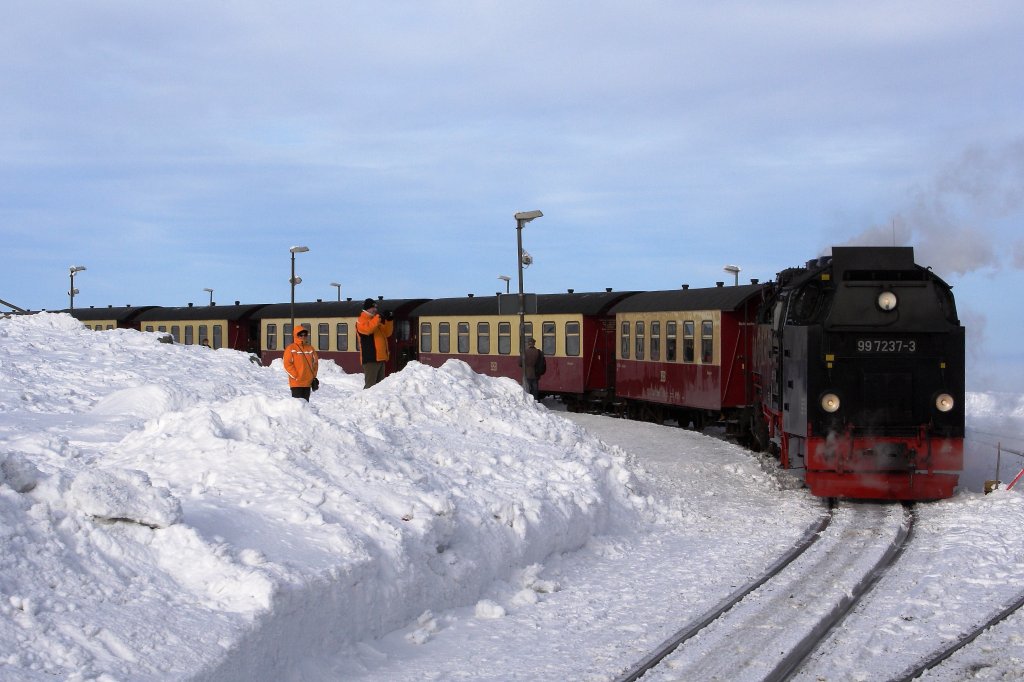 Bei der Ankunft unseres Sonderzuges  Quedlinburger Brockenexpress  am 26.01.2013 treffen wir im Brockenbahnhof auf eine  alte Bekannte ! 99 7237 steht auf Gleis 1 bereit zur Abfahrt mit P8930 in Richtung Wernigerode. (Aufnahme aus dem fahrenden Zug)