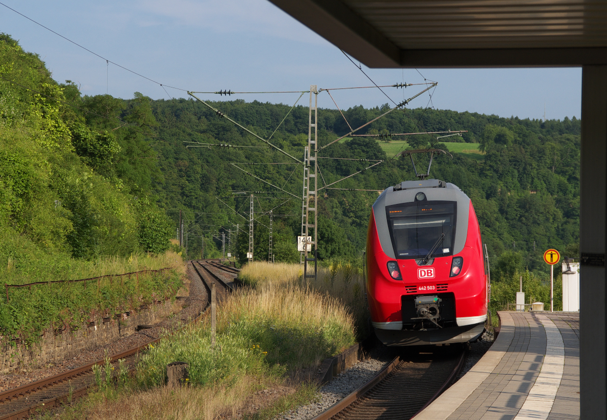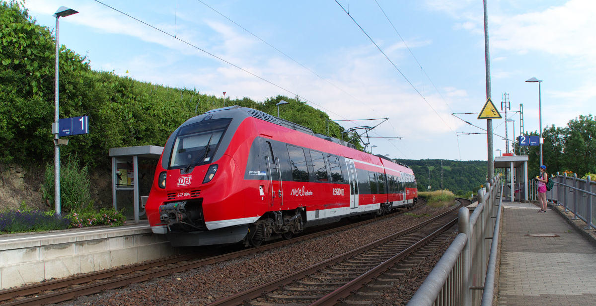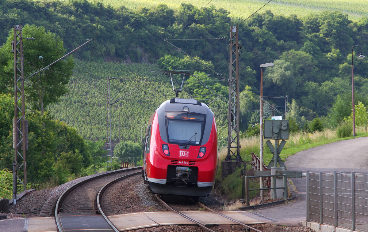 Ein Hamsterbäckchen auf Mosel Tour. Montag - Freitag verkehren die Regionalbahnen auf der Obermoselstrecke sogar bis Wittlich Hbf. ehemals Wengerohr. Samstag und Sonntag geht es nur zwischen Trier Hbf. und Perl hin und her. Während die Bundesstraße manchmal etwas abkürzt, verläuft die Obermoselstrecke meist am Fluss entlang. 442 004 fährt gerade in Richtung Trier aus den Haltepunkt Wehr Mosel aus. 06.07.2013 - KBS 692 - Bahnstrecke 3010 Koblenz - Perl Grenze (Frankreich) Erhard Pitzius
