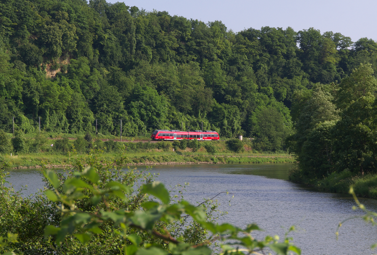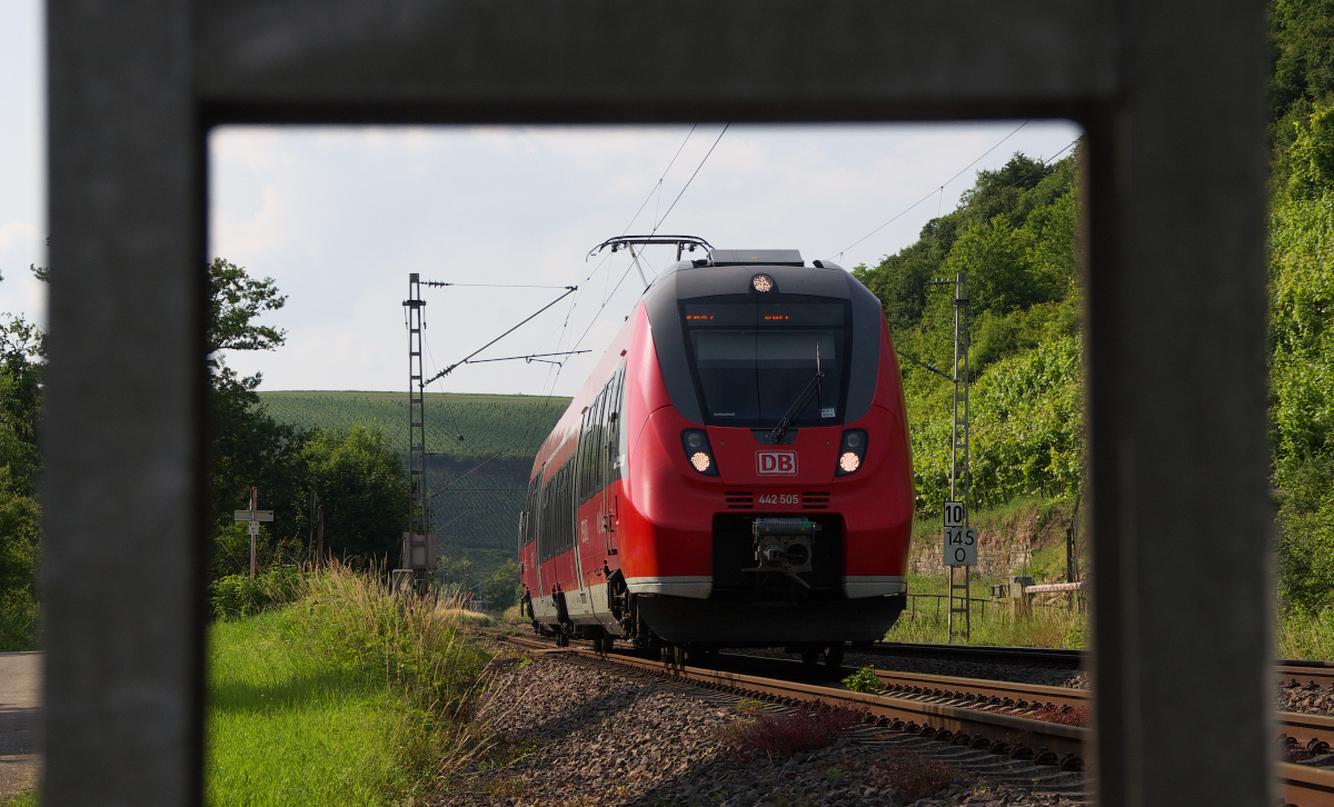 Ein Hamsterbäckchen auf Mosel Tour. Montag - Freitag verkehren die Regionalbahnen auf der Obermoselstrecke sogar bis Wittlich Hbf. ehemals Wengerohr. Samstag und Sonntag geht es nur zwischen Trier Hbf. und Perl hin und her. Während die Bundesstraße manchmal etwas abkürzt, verläuft die Obermoselstrecke meist am Fluss entlang. 442 005 fährt in Richtung Perl zwischen Wehr (Mosel) und Palzem. 06.07.2013 - KBS 692 - Bahnstrecke 3010 Koblenz - Perl Grenze (Frankreich) Erhard Pitzius