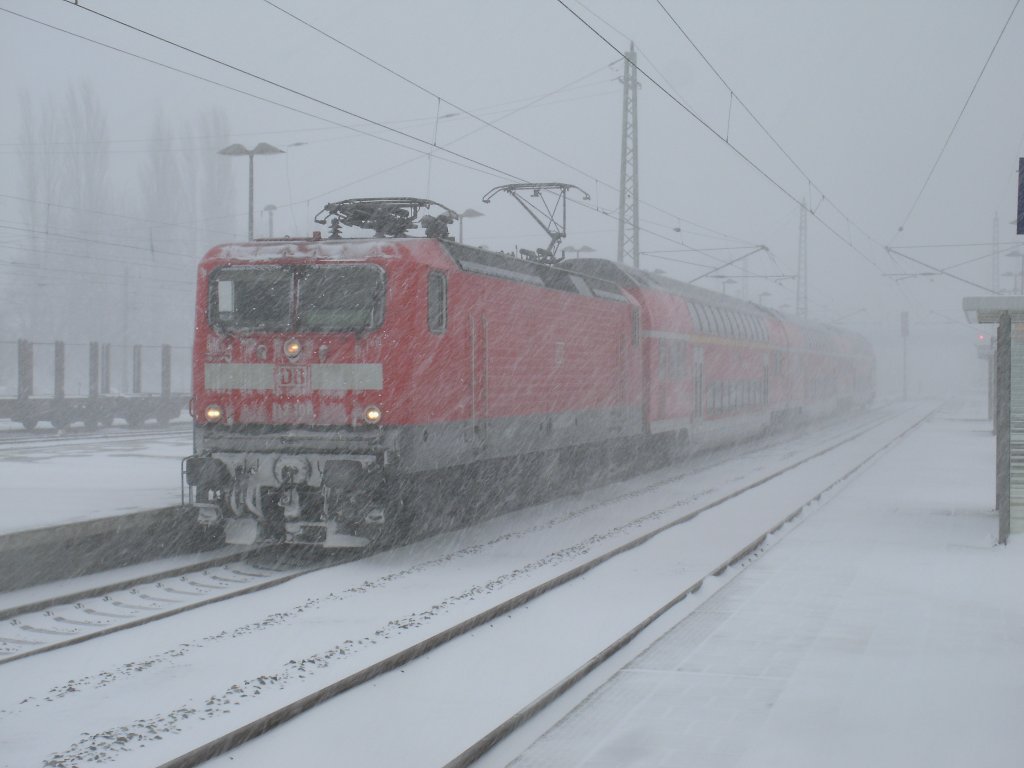 Heftiger Schneefälle am 10.März 2013 über Norddeutschland.Auch Rügen blieb nicht verschont.So kämpfte sich 112 108 mit dem RE 13006 von Sassnitz nach Rostock.Hier beim Halt in Bergen/Rügen. Mirko Schmidt