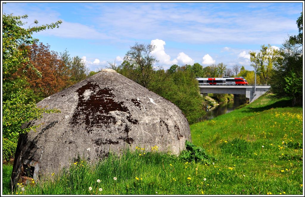 Im Sommer 2013 wurden zwischen St.Margrethen und Lustenau drei neue Brücken in Betrieb genommen. 1. die Bogenbrücke über die Autobahn N13 2. die Brücke über den Binnenkanal 3. die grosse Bogenbrücke mit den beiden Vorlandbrücken über den Rhein. Der Streckenverlauf ist einspurig. Die S3 5754 nach Bregenz überquert den Binnenkanal. Der Grenzverlauf wurde zur Zeit des 2.Weltkrieges durch solche Bunker gesichert. (22.04.2012) Herbert Graf