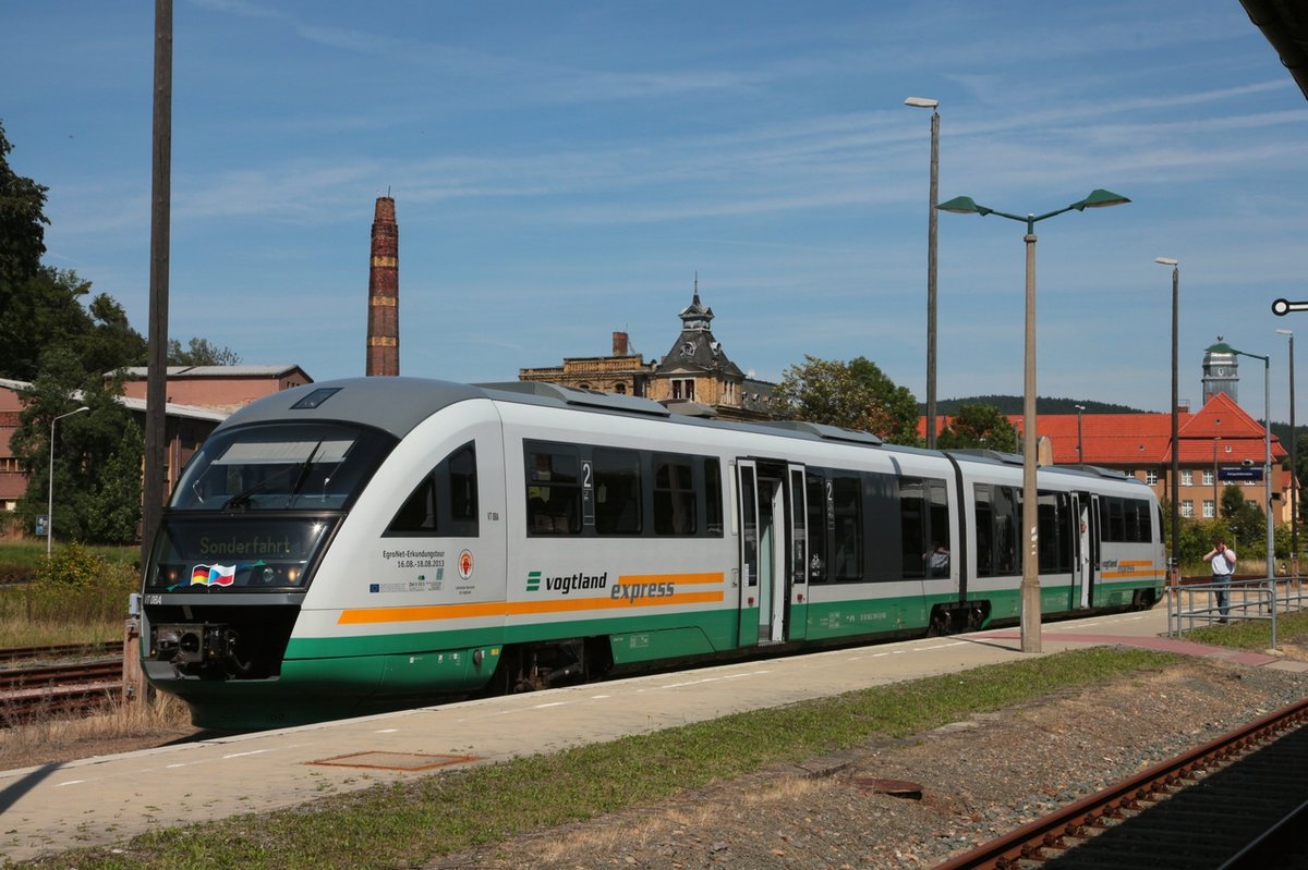 Start zur Egronet-Erkundungstour, organisiert durch den Verein Dialog mit Böhmen, am 16.08.2013 in Greiz. Zum Einsatz kam der entsprechend beklebte VT08 der VBG, damals noch mit Vogtlandexpress beschriftet. Rüdiger Ulrich