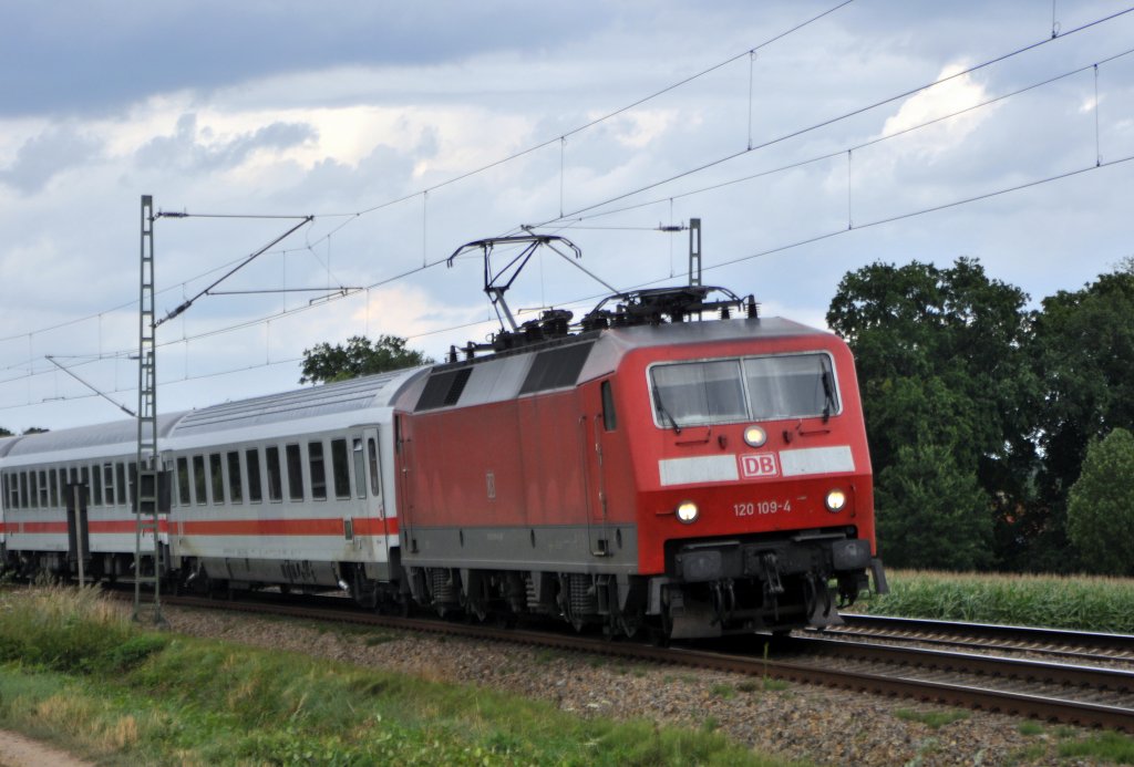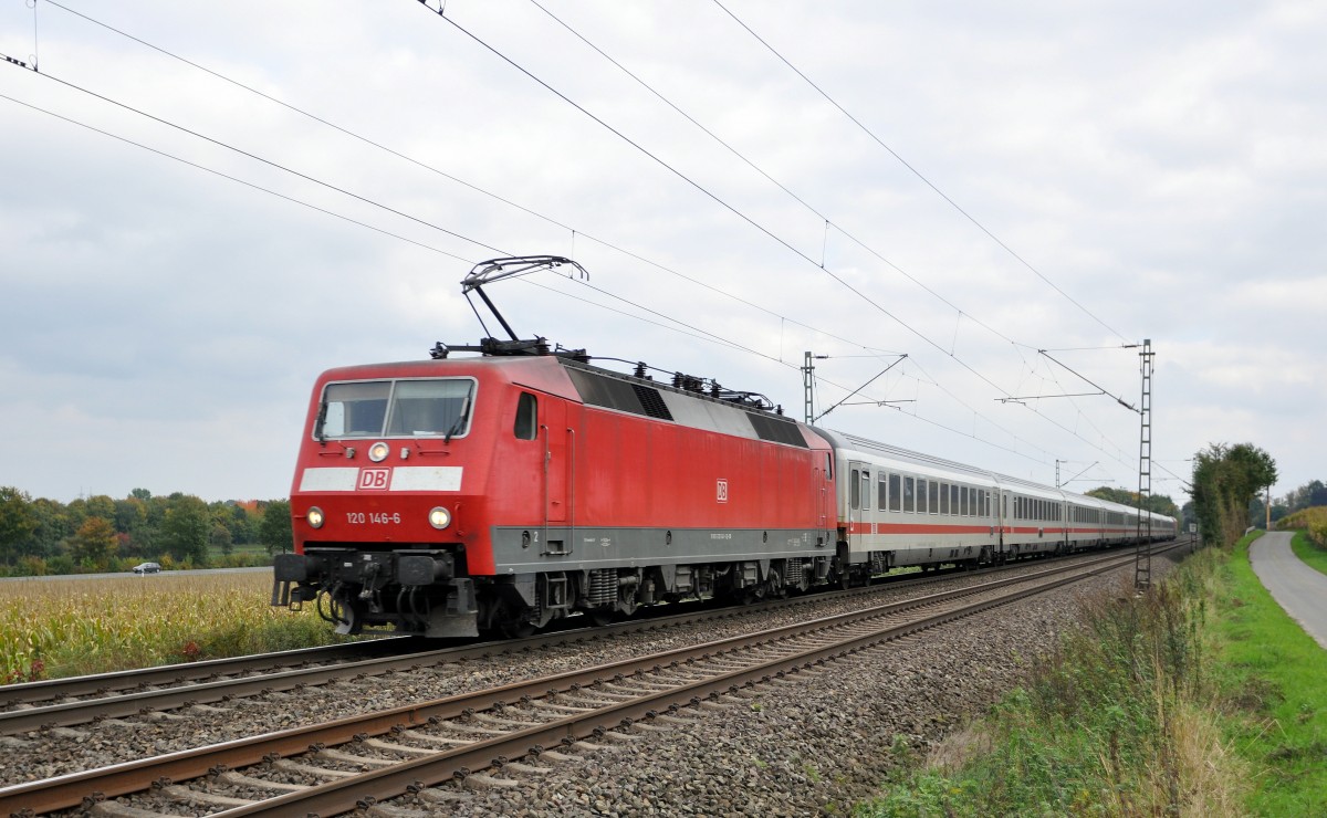 DB Fernverkehr 120 146 und eine unbekannte 101er (am Zugschluss) mit IC 2311 Westerland (Sylt) - Stuttgart Hbf (Bohmte-Stirpe, 13.10.13). Reinhard Kühn