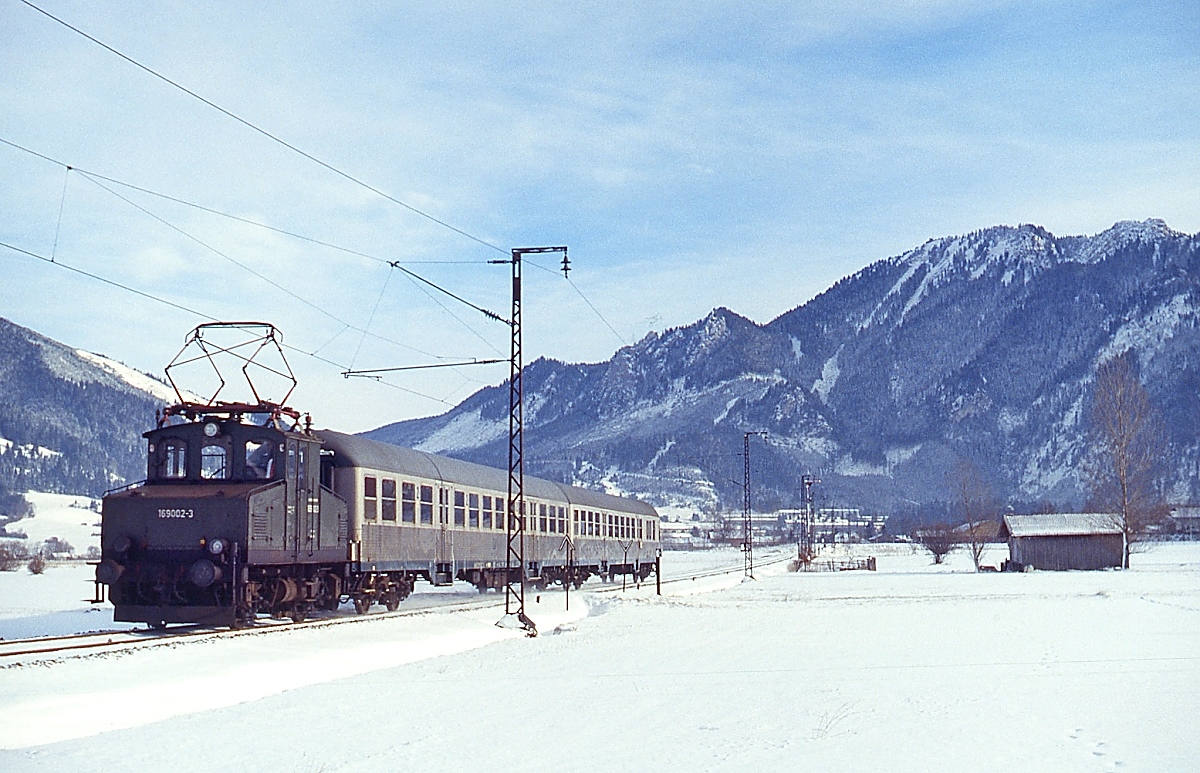 Im Januar 1979 hat 169 002-3 mit ihrem Personenzug nach Murnau den Bahnhof Overammergau verlassen