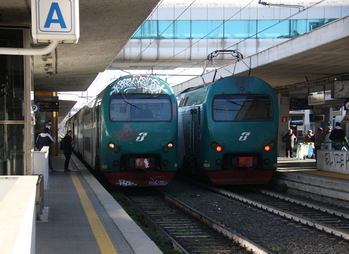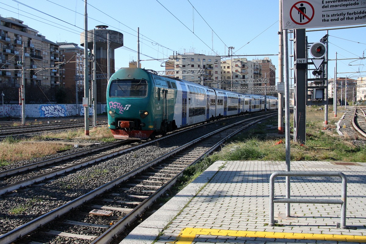 Ein italienischer Doppeldecker kommt aus Richtung Roma-Trastevere(I) und fährt in Roma-Ostiense(I) ein bei schönem Sonnschein am Mittag vom 29.12.2014. Stefan Hochstetter