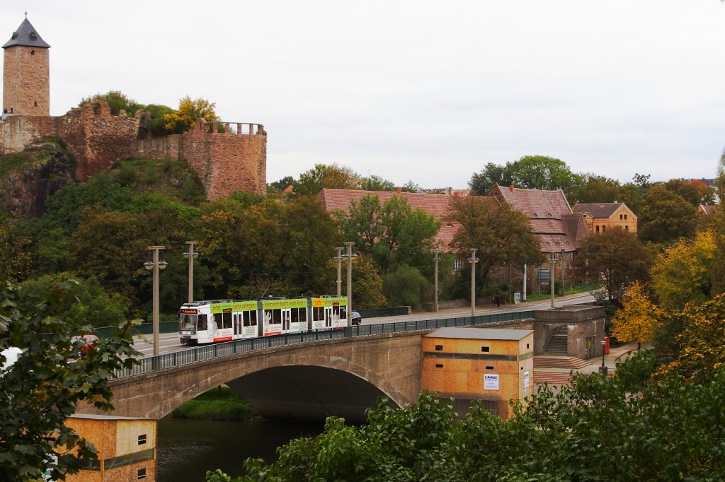 Ein Straßenbahnzug der Linie 7 in Richtung Grenzstraße am 05.10.2011 beim Überqueren der Giebichensteinbrücke über die Saale vor der Kulisse der Burg Giebichenstein, aufgenommen vom Pavillon des Restaurants "Bergschenke" in Halle-Kröllwitz. Die beiden "Holzkisten" direkt vor der Brücke sind Bauverschalungen und beinhalten zwei Großskulpturen (Kuh und Pferd) welche zurzeit aufwändig restauriert und voraussichtlich 2014 fertiggestellt sein werden. Michael Edelmann