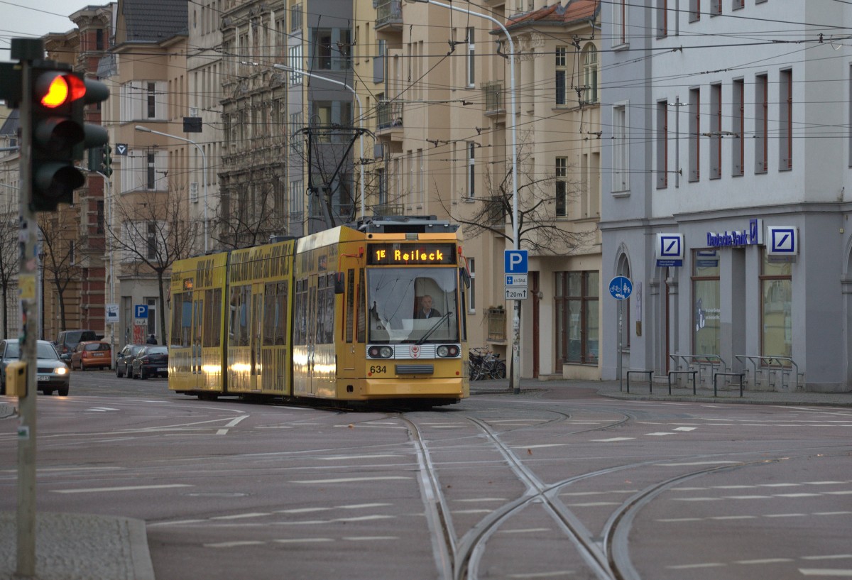 Bis in die zeitigen Nachmittgastunden des 24.12. 2014 ist noch reger Straßenbahnbetrieb in Halle. Ein Zug der Linie 1E am Reileck. 14:53 Uhr. Siegfried Heße
