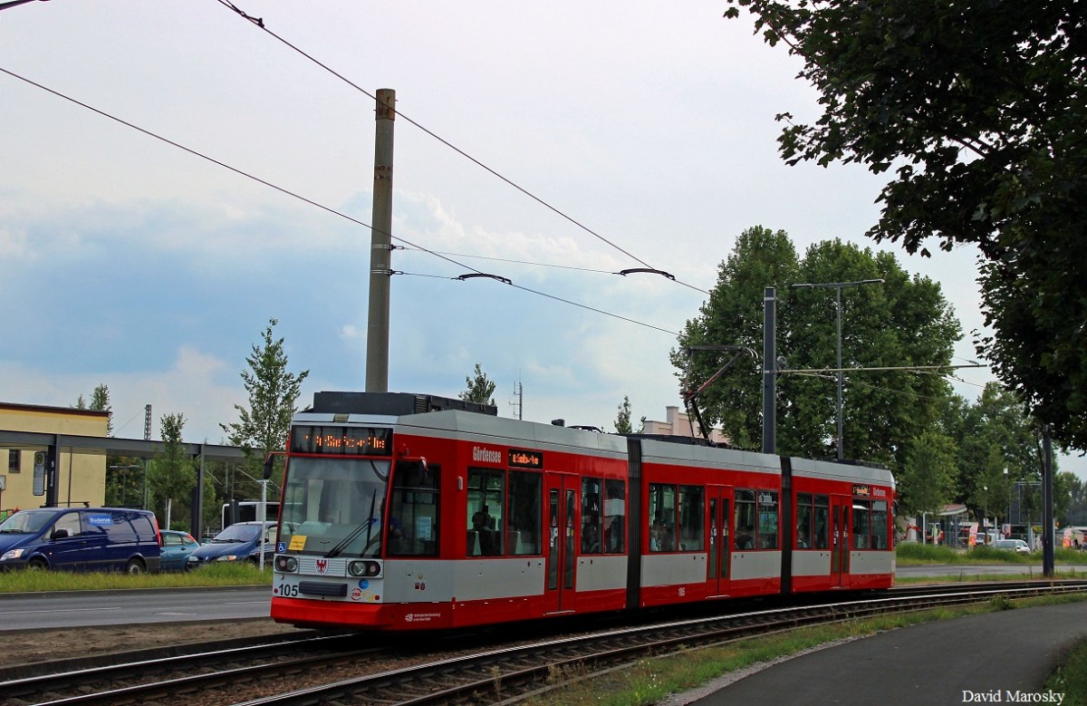 Der ehemalige TW 501 der SWH.HAVAG Halle (Saale) verdient sich nun seinen Strom bei der VBBr als TW 105. Seit 2014 ist der MGT6D in der Havelstadt im Einsatz.