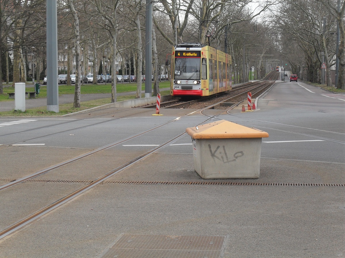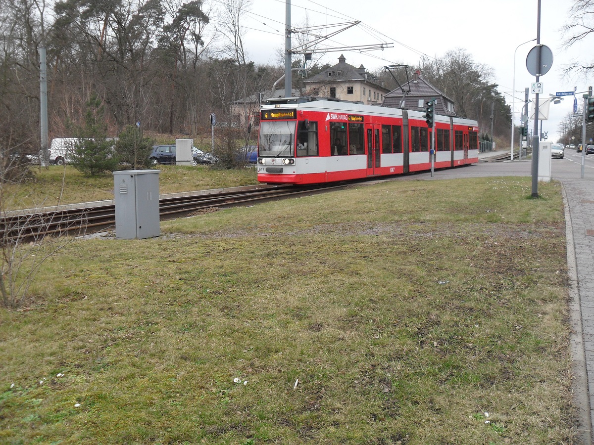 Straßenbahnlinie 4 der HAVAG befindet sich am 13.02.2014 vom Hauptbahnhof kommend in Richtung Halle-Kröllwitz fahrend gerade zwischen den Haltestellen Straßburger Weg und Heide. Mittelbach