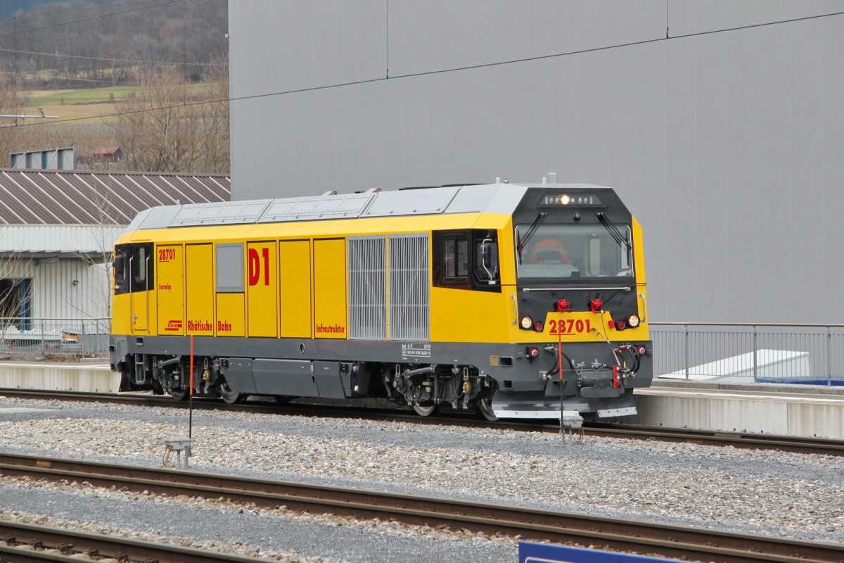 Das neue Infrastruktur Fahrzeug der RhB,Gmf4/4 D1 Nr.28701(Schalker Eisenhütte Maschinenfabrik GmbH)auf Schulungsfahrt in Trimmis/Untervaz.21.01.14 Peter Walter