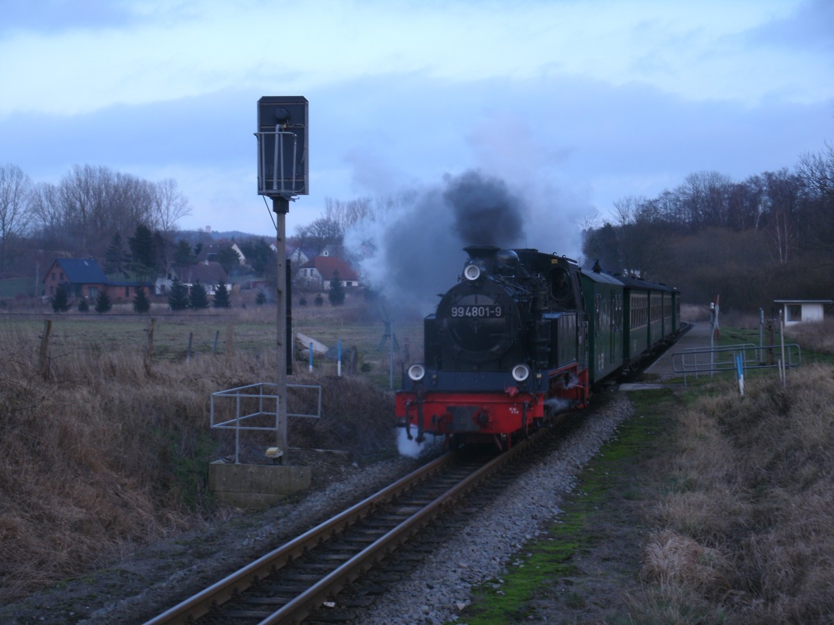 Im letzten Licht des Tages und bei nur 2 Grad lässt es 99 4802 bei Ausfahrt aus Sellin-Ost in Richtung Binz - Putbus ganz schön dampfen; 07.02.2014