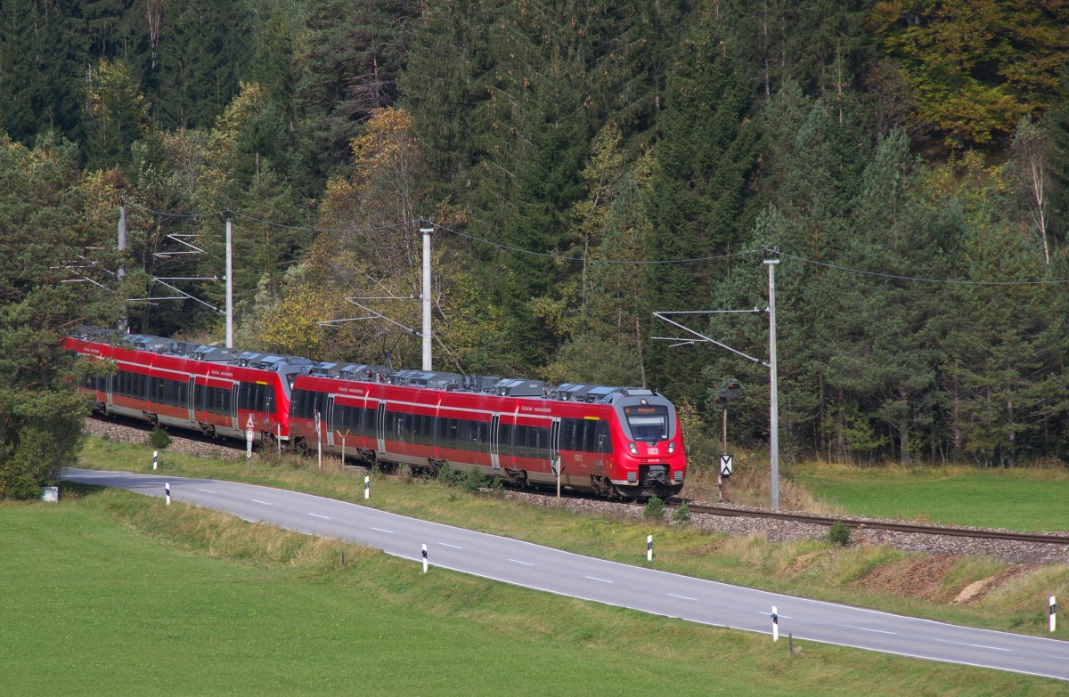 Über die Grenze kommen die Talent Triebwagen der ÖBB Baureihe 4024. Die Relation Innsbruck - Garmisch-Partenkirchen hat der Triebwagen fast zurück gelegt. Gleich wird vorher noch im Bahnhof Klais gehalten. Hier kommt der REX (in Österreich) gerade die Schmalenseehöhe hinunter. Bahnstrecke 5504 München Hbf. - Mittenwald Grenze an der St2542 Am Quicken. 07.10.2014 Erhard Pitzius