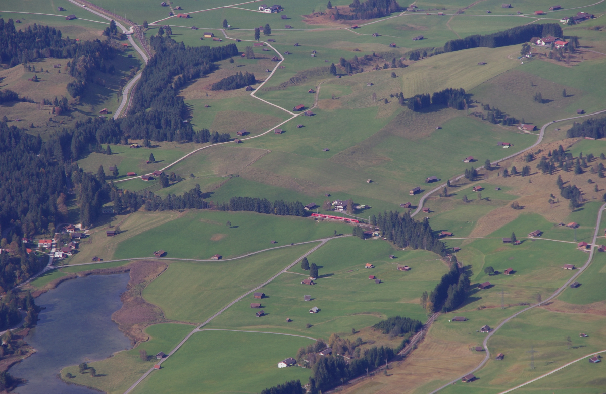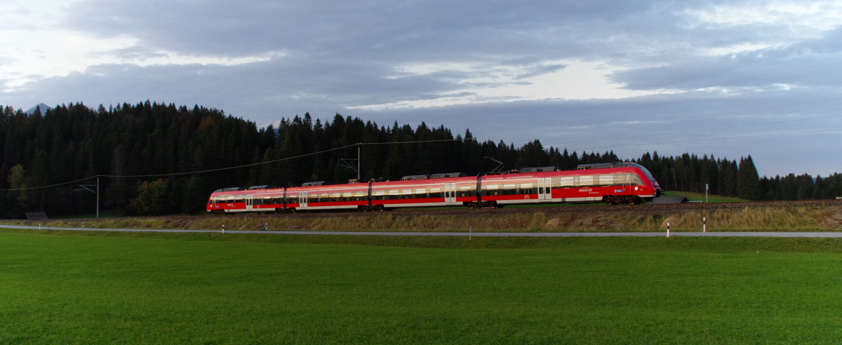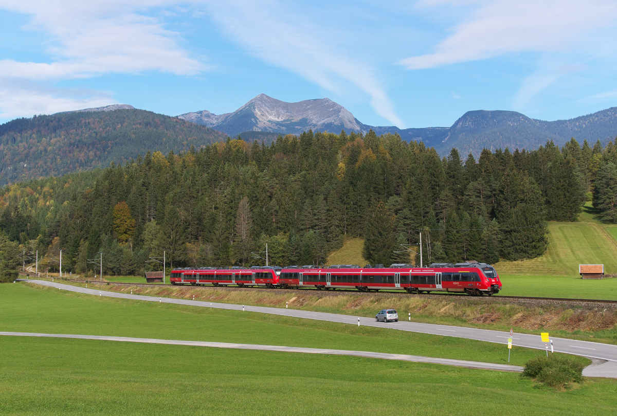 Die RB München Hbf. - Seefeld in Tirol summt jetzt die Schmalenseehöhe hinauf und nach 960 Metern über NN geht es wieder bergab nach Mittenwald. Im Hintergrund das Estergebirge, das sich von Garmisch-Partenkirchen bis zum Walchensee hinzieht.