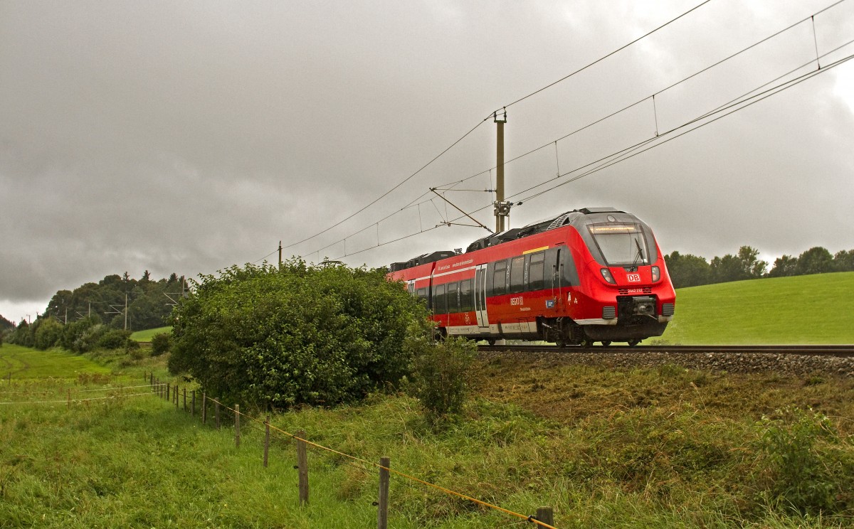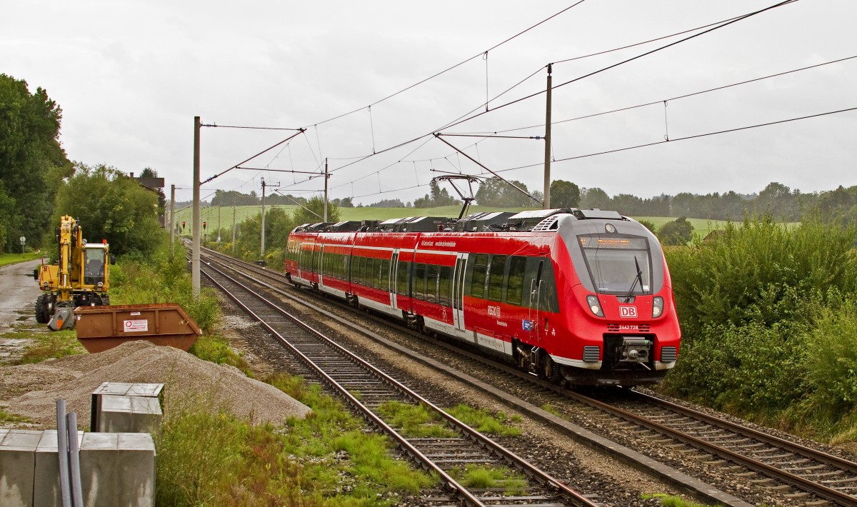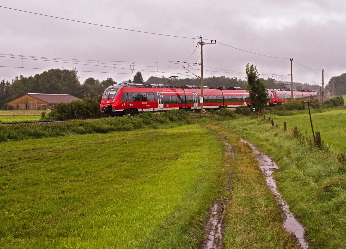 Sauwetter im Pfaffenwinkel. 442.724 ist am verregneten 27. August mit einem Schwestertriebwagen bei Polling unterwegs. In wenigen Minuten ist Weilheim (Oberbayern) erreicht. Martin Hanslbauer