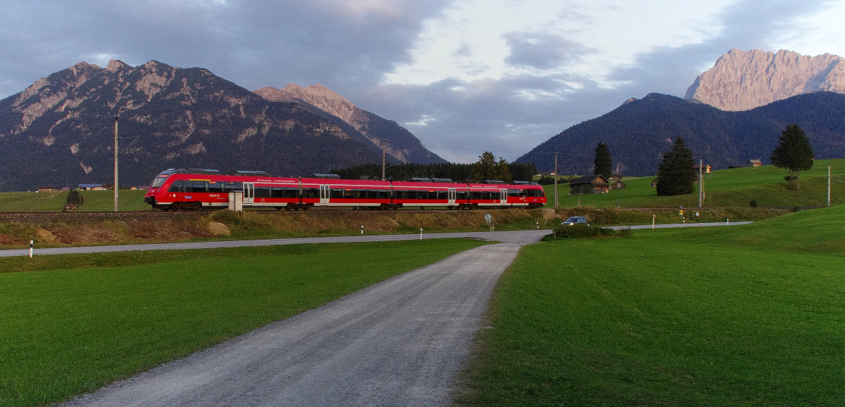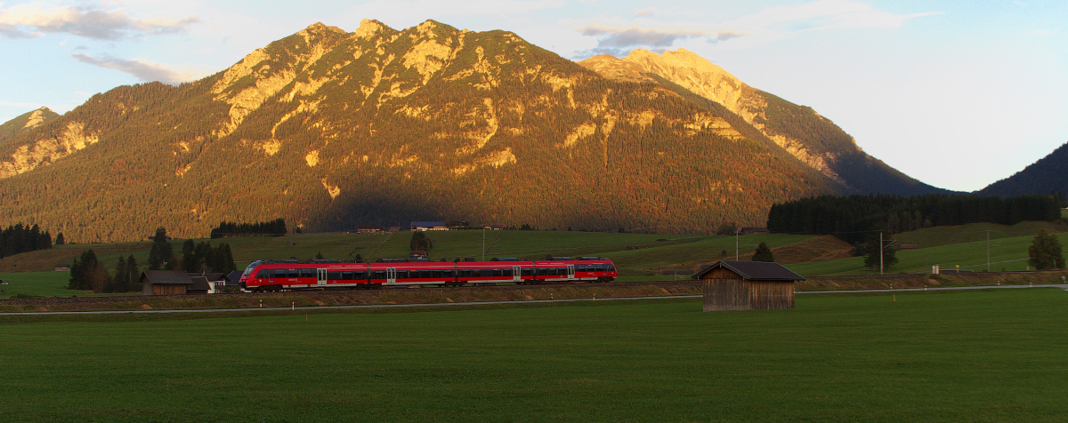 Das Ticket ist 4 Euro billiger als das Bayern Ticket. Ein Hamsterbäckchen kommt als RB nach München die Schmalenseehöhe herunter. Wir hatten den Nachmittag auf dem Karwendel verbracht und genossen noch die Abendsonne und das schöne Wetter bei unserem Landhaus Wackerl, unserem Gästehaus direkt an der Mittenwaldbahn.
