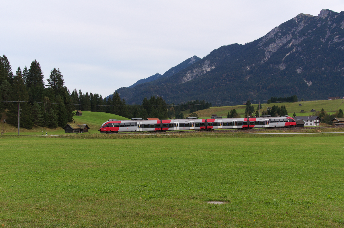 Über die Grenze kommen die Talent Triebwagen der ÖBB Baureihe 4024. Die Relation Innsbruck - Garmisch-Partenkirchen hat der Triebwagen fast zurück gelegt. Gleich wird vorher noch im Bahnhof Klais gehalten. Hier kommt der REX (in Österreich) gerade die Schmalenseehöhe hinunter. Wir waren mit dem ÖBB Talent nach Innsbruck gefahren und mit dem DB Talent nach München. Die Werdenfels Hamsterbäckchen sind wesentlich besser gepolstert als die ÖBB Triebwagen im Tirol Takt. Bahnstrecke 5504 München Hbf. - Mittenwald Grenze an der St2542 am 07.10.2014 Ivonne Pitzius