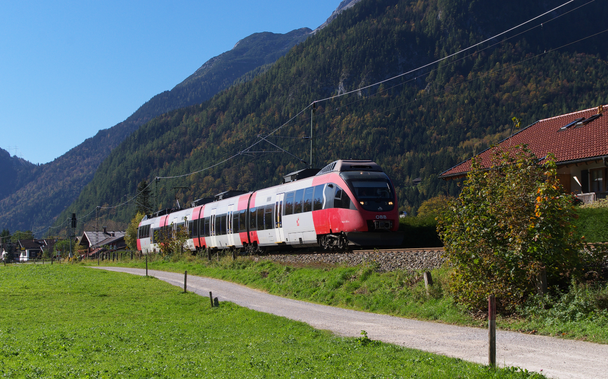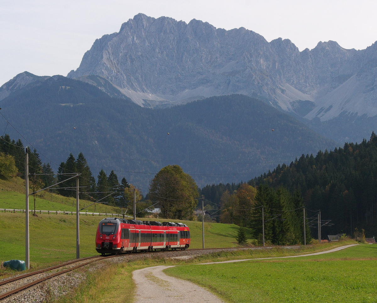 Immer Zeit für ein Eisenbahnfoto - Obwohl wir schon gute 10 Kilometer in den Beinen hatten und auf dem Rückweg vom Lautersee waren, wurde ich beim Geräusch des herannahenden ÖBB Talent nervös und die Kamera ging automatisch in Stellung. 4024 075-6 aus Garmisch-Partenkirchen nach Innsbruck Hbf. hat gerade den Ortsrand von Mittenwald erreicht und wird in einigen hundert Metern im Bahnhof halten. 09.10.2014 - Bahnstrecke 5504 München - Mittenwald Grenze Ivonne Pitzius