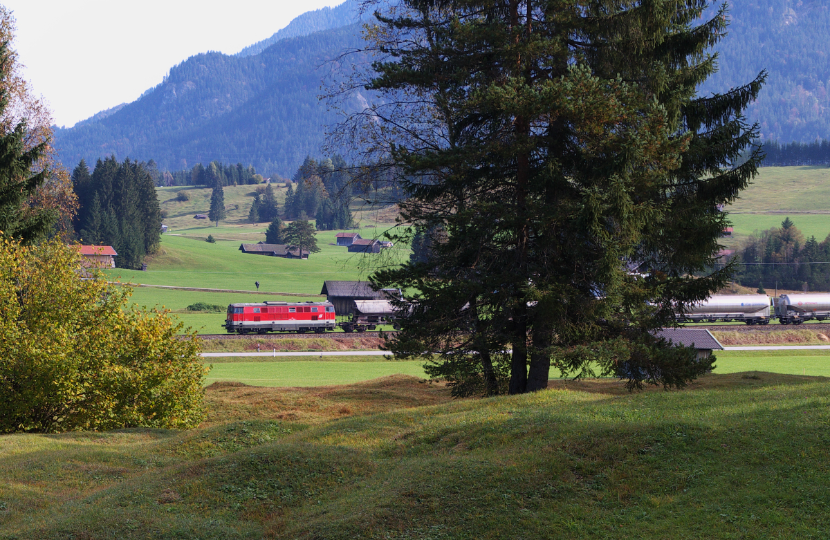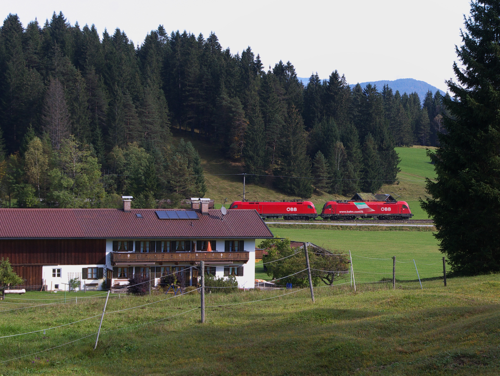 Die RB nach Mittenwald war schon vorbei, eigentlich war Zugpause angesagt. Gerade an diesem Tag rollte der Güterzug Vils (Tirol) - Garmisch-Partenkirchen - Innsbruck - Hall (Tirol) zwei Stunden früher als sonst über die Gleise und noch in einer besonderen Bespannung. Also wir 100 Meter zurück gesprintet und schon rauschten zwei Tauri am Landhaus Wackerl vorbei. Im Normalfall sind ein Hercules und ein Taurus am Zug und es kam noch etwas nach........Bahnstrecke 5504 München Hbf. - Mittenwald Grenze - 06.10.2014 Ivonne Pitzius