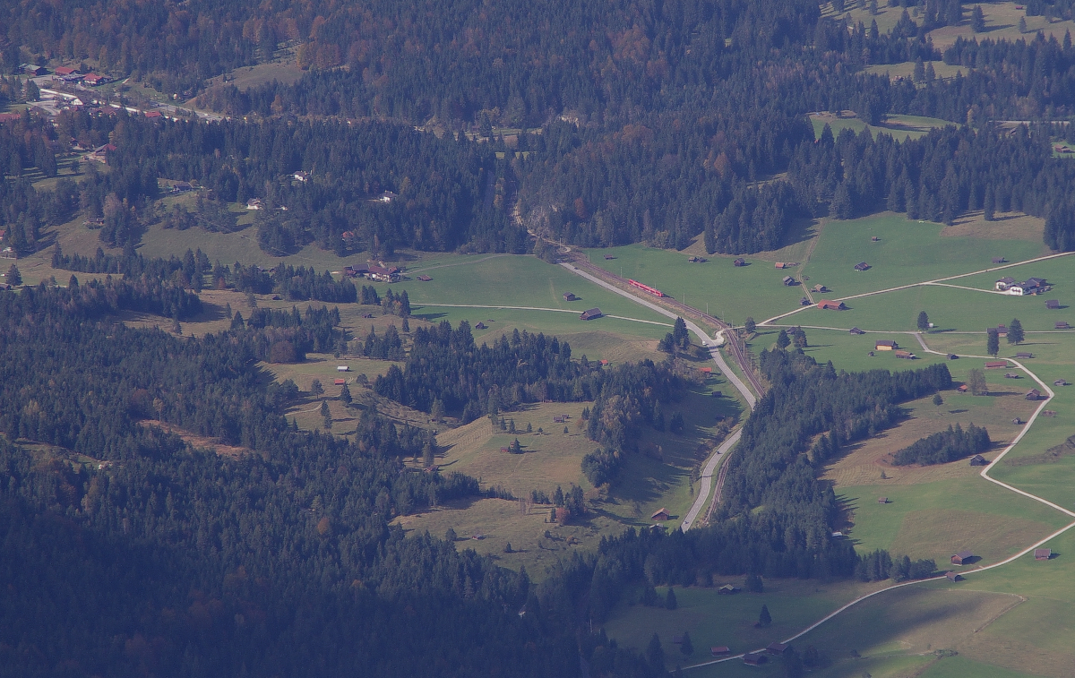 Die Bergstation liegt auf 2244 Meter Höhe. Die RB nach München ist beim Sepplhof angekommen und erreicht gleich die Schmalenseehöhe (960 Meter), von dort aus geht es bergab über Klais in Richtung Garmisch-Partenkirchen. Bahnstrecke 5504 München - Mittenwald/Grenze Ivonne Pitzius