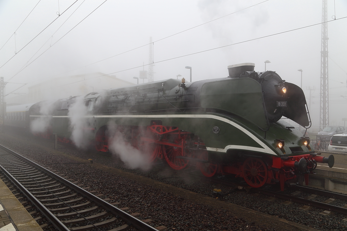 Kurz bevor es mit einem Sonderzug der SVC in Richtung Halle/S.Hbf, Weißenfels, Erfurt, Arnstadt und Oberhof, ins Dampflokwerk nach Meiningen geht, um dort die vereinseigene Dampflok 52 8079 nach erfolgter Hauptuntersuchung abzuholen, dampft 18 201, bei dickem Nebel, am Morgen des 29.03.2014 im Startbahnhof Lutherstadt Wittenberg, gemütlich vor sich hin. Michael Edelmann