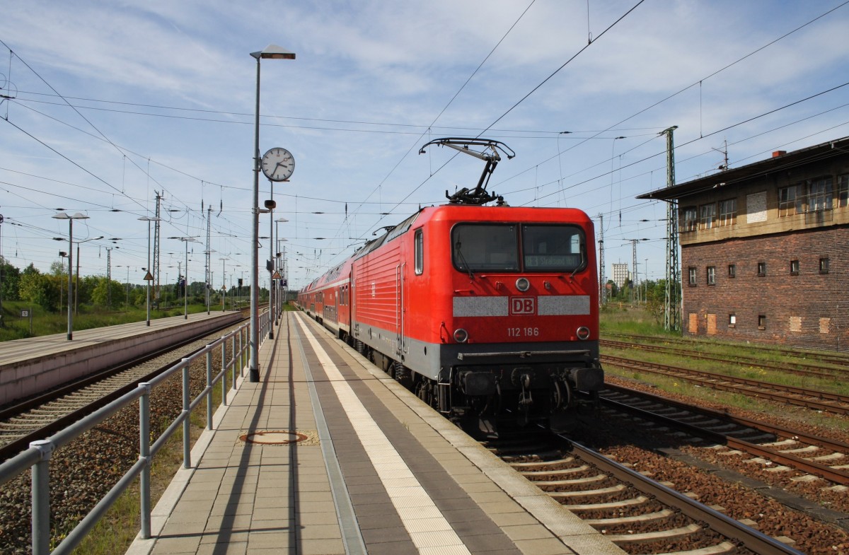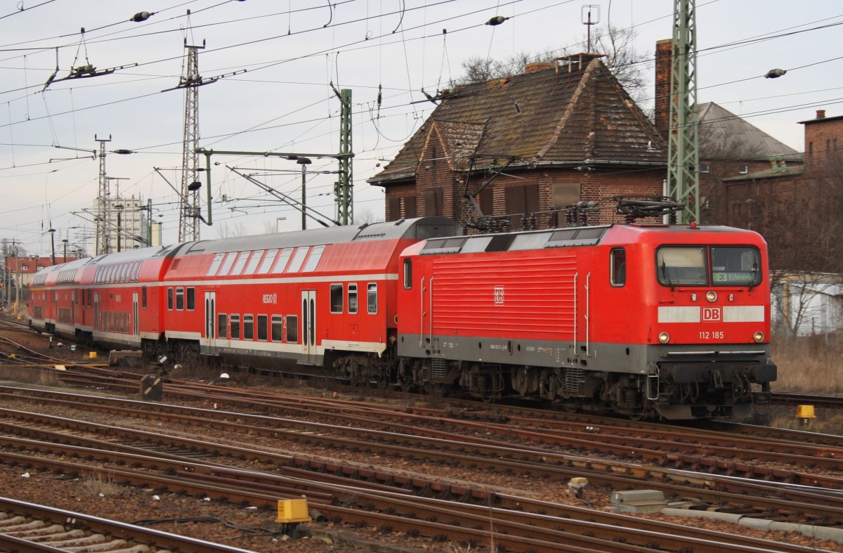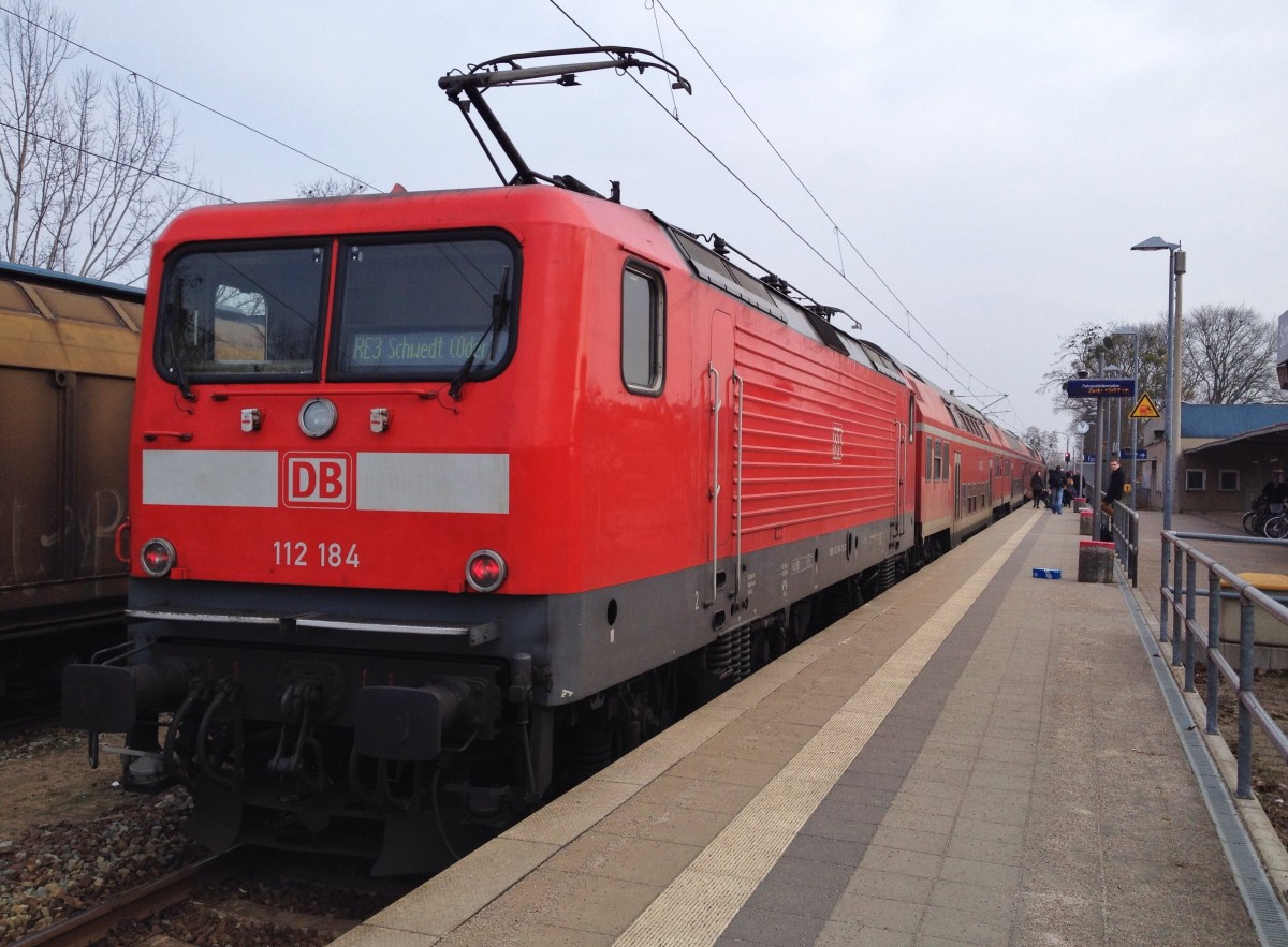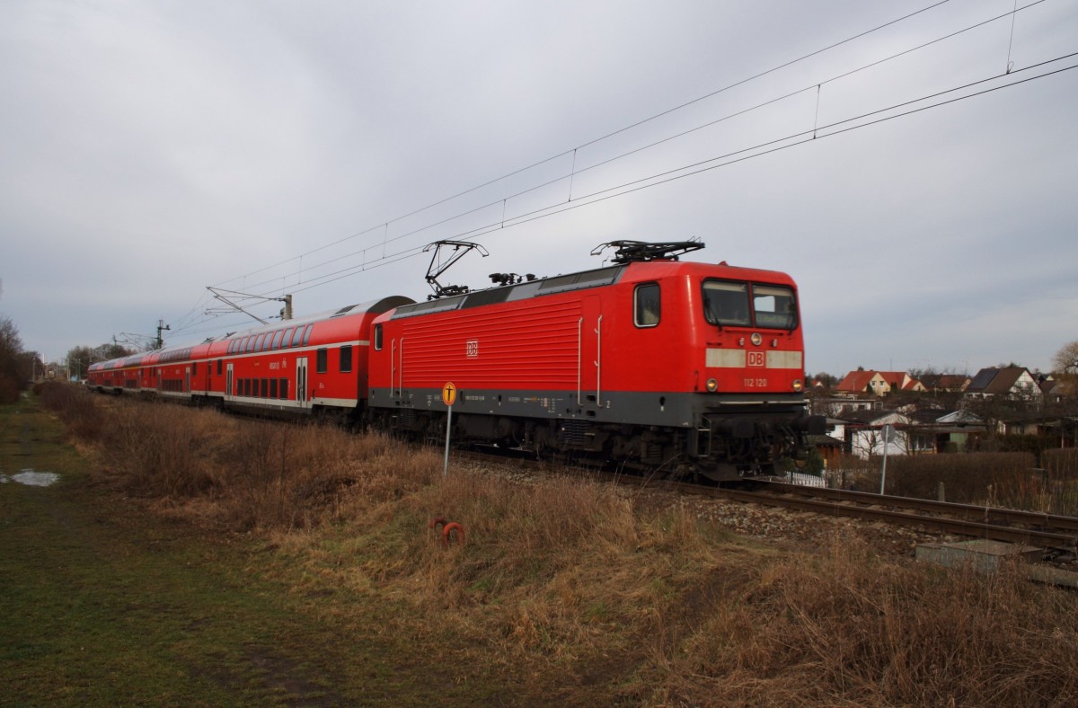 Hier 112 120 mit einem RE3 (RE18346) von Wünsdorf-Waldstadt nach Schwedt(Oder), am 8.2.2014 zwischen Vierradener Chaussee und Helbigstraße in Schwedt(Oder). Alexander