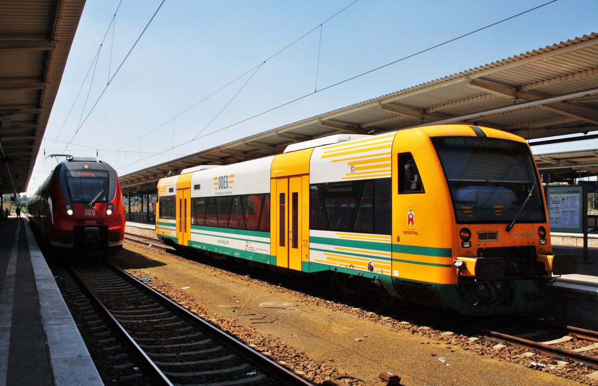 Hier links 442 831-4 als RE7 (RE93118) "Airport-Express" von Berlin Lichtenberg nach Berlin Schönefeld Flughafen und rechts 650 068-9 "Naturparkstadt Biesenthal" als RB36 (RB79635) von Berlin Lichtenberg nach Wendisch-Rietz, diese beiden Triebzüge standen am 19.7.2014 in Berlin Lichtenberg. Alexander