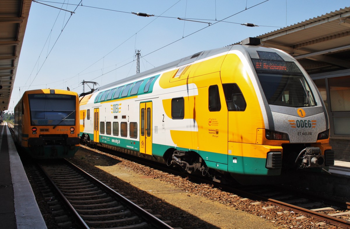 Hier links 650 067-2 "Oderbruch-Hauptstadt Wriezen" als RB60 (RB79551) von Berlin Lichtenberg nach Eberswalde Hbf. und rechts 445 115-9 "Eberswalde" als RE2 (RE92964) von Berlin Lichtenberg nach Cottbus, diese beiden Triebzüge standen am 19.7.2014 in Berlin Lichtenberg. Alexander