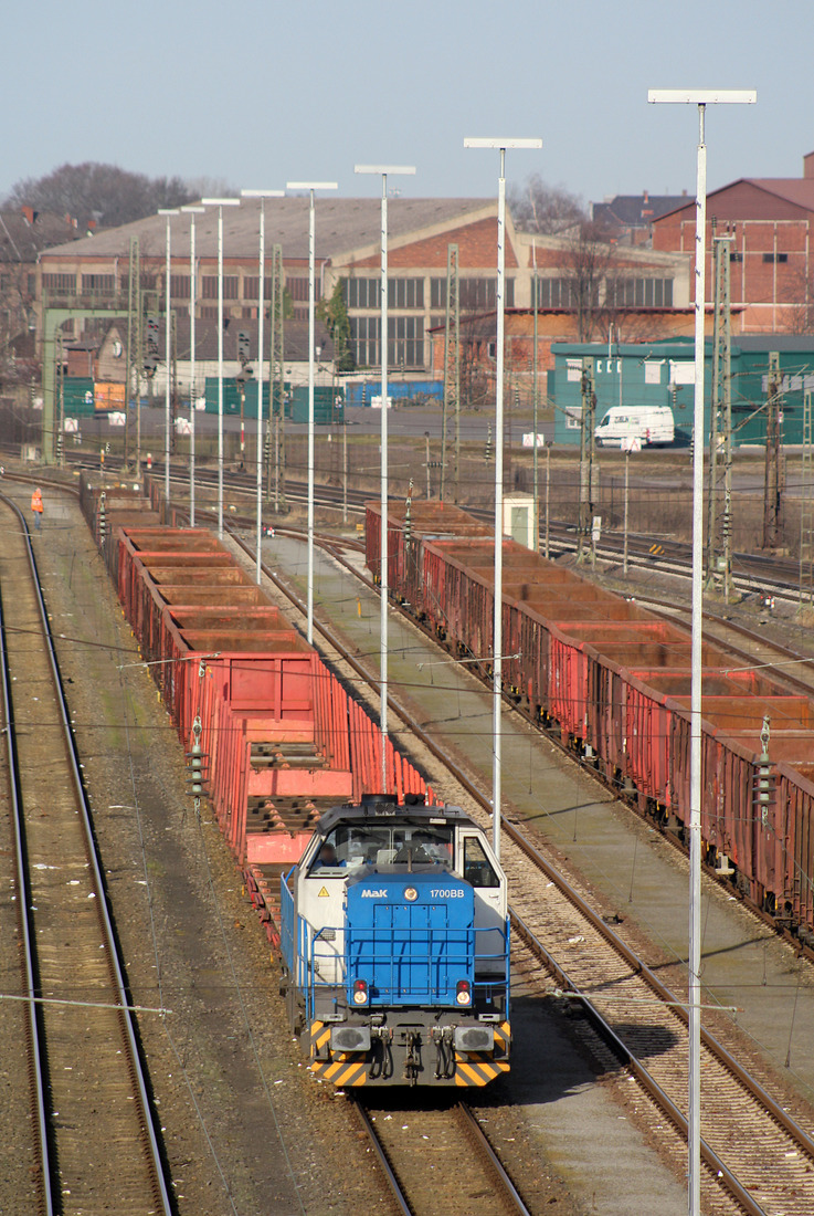 Eine MaK 1700BB (277 005-5) von der PVS fährt mit einem gemischten Güterzug am 29.04.2014 am km45,2 zwischen Peine und Vechelde nahe Sierße durch. Matthias Hartmann