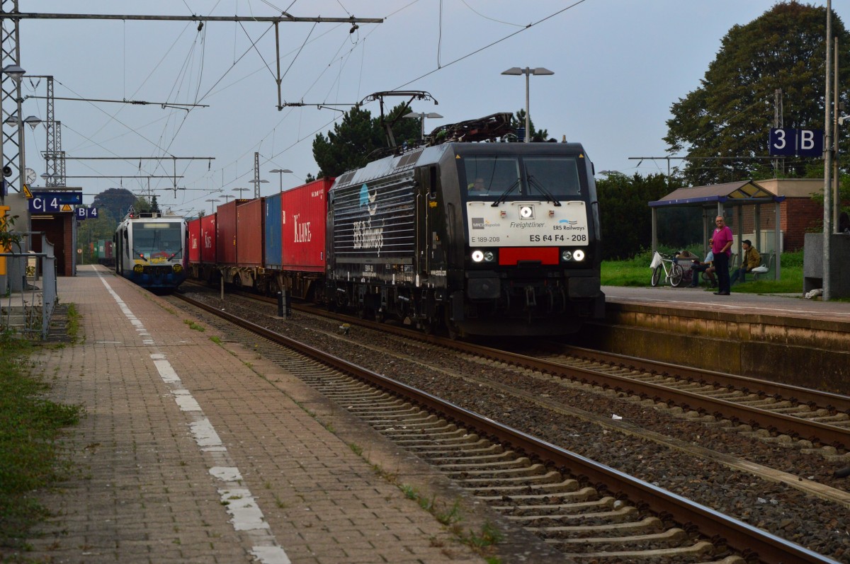 Meeting in Rheydt Hbf, hatten die ERS 189 208 mit ihrem Kastelzug und der RTB 654 003 der als RB 39 nach Mönchengladbach unterwegs ist. Wenn der Containerzug durch ist bekommt er fahrt und eilt nach MG Hbf. 2.10.2014 Andreas Strobel