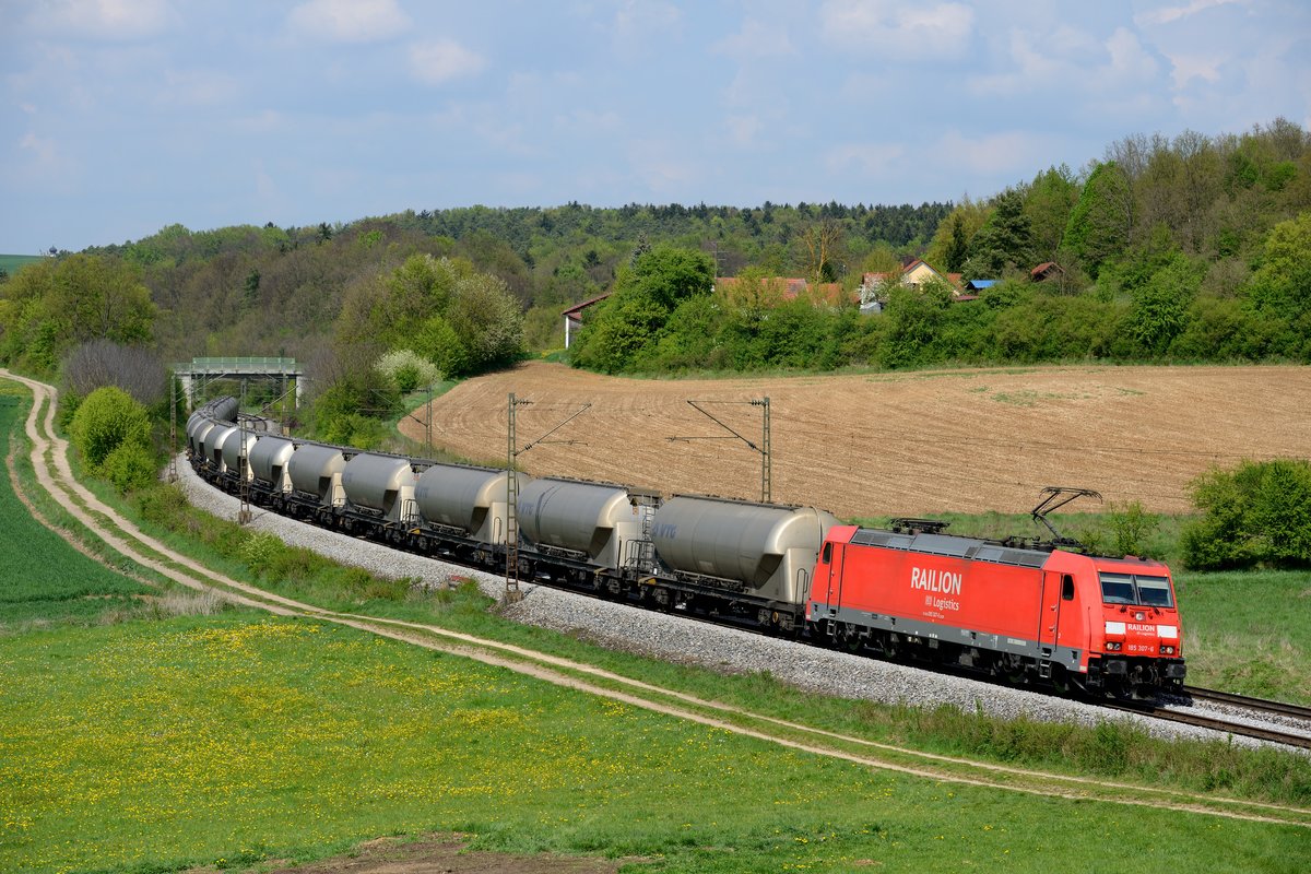 Im Laufe des 25. April 2014 zog in der Oberpfalz starke Quellbewölkung auf. Als 185 307 mit einem Ganzzug, gebildet aus Silowagen der VTG, die Fotostelle passierte, gab es gerade ein "Sonnenloch" in der Wolkendecke und die frühlingshafte Landschaft bei Edlhausen wurde komplett ausgeleuchtet. Christoph Schneider