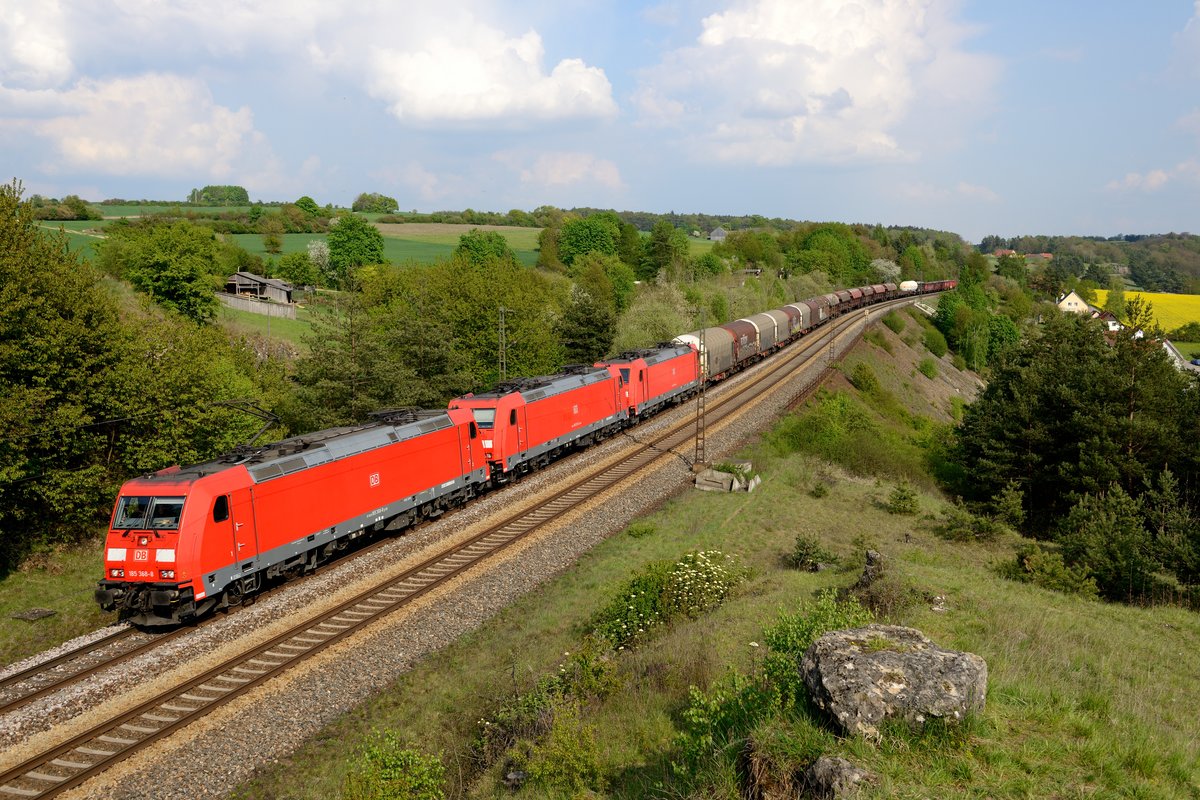 Nach dem Doppel kam ein Tripple - beteiligte Akteurinnen: 185 368, 224 und 355 - die beiden letzteren allerdings kalt geschleppt. Aufgenommen am 25. April 2014 bei Laaber vor einem gemischten Güterzug nach Nürnberg Rangierbahnhof. Christoph Schneider