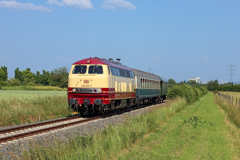 Anlässlich des Bahnhofsfestes in Königstein (Taunus) fuhr am 8.6.2014 die 218 105 mit 2 Wagen zwischen Königstein und Frankfurt-Höchst. Pünktlich kam sie durch Liederbach Markus Ü.