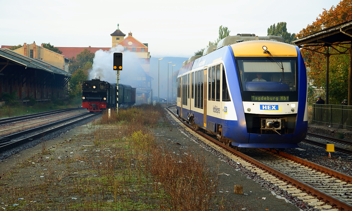 Doppeleinfahrt am Morgen des 18.10.2014 in den Bahnhof Quedlinburg. Während links Dampflok 99 6101 einen Sonderzug der IG HSB zur Fahrt nach Hasselfelde bereitstellt, rollt rechts LINT-Triebwagen VT 809 des HEX-Unternehmens ein. Der Name HEX (Harz-Elbe-Express) trifft in diesem Fall wortwörtlich zu, denn der Triebwagen ist unterwegs von Thale (Harz) nach Magdeburg (Elbe). Michael Edelmann