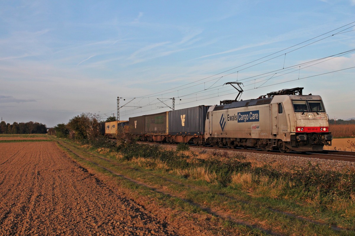 In der untergehenden Sonne des 31.10.2014 fuhr die Mannheimer 185 301-9 mit einem gemischten Güterzug bei Buggingen der Schweizer Grenze entgegen. Tobias Schmidt