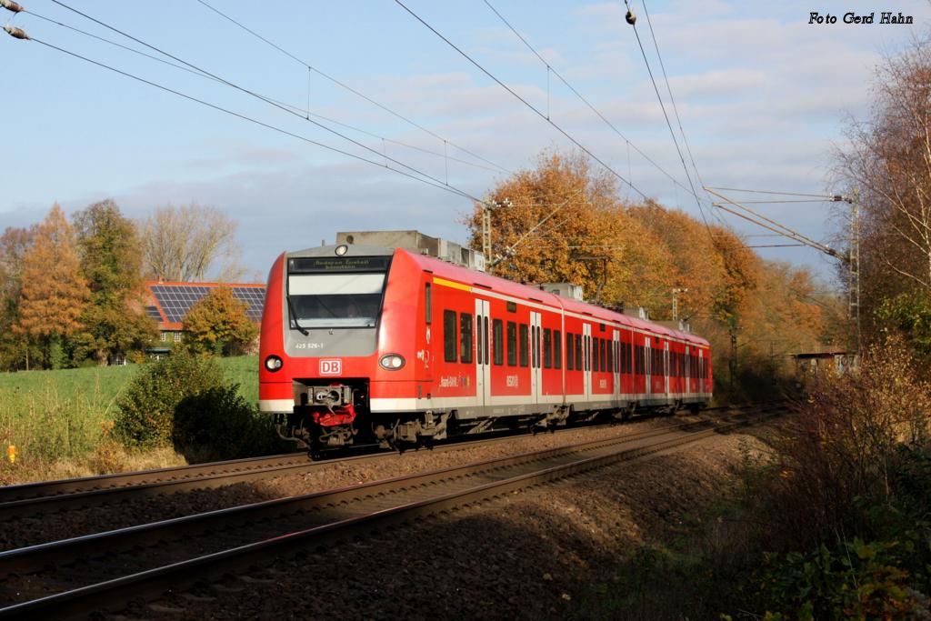 Anderswo ein tägliches Bild, aber auf der Rollbahn zwischen Osnabrück und Münster eine Rarität: 425526 als Leerzug am 21.10.2014 um 12.28 Uhr unterwegs am Ortsrand von Hasbergen in Richtung Münster. Gerd Hahn