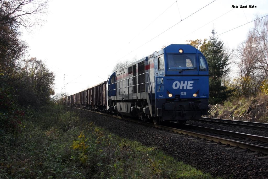 Immer freitags befördert die OHE einen Schrottzug vom Ruhrgebiet zum Stahlwerk in Georgsmarienhütte! OHE 1028 erreicht hier gerade am 21.11.2014 um 12.56 Uhr den Ortsrand von Hasbergen und ist in Richtung Georgsmarienhütte unterwegs. Gerd Hahn