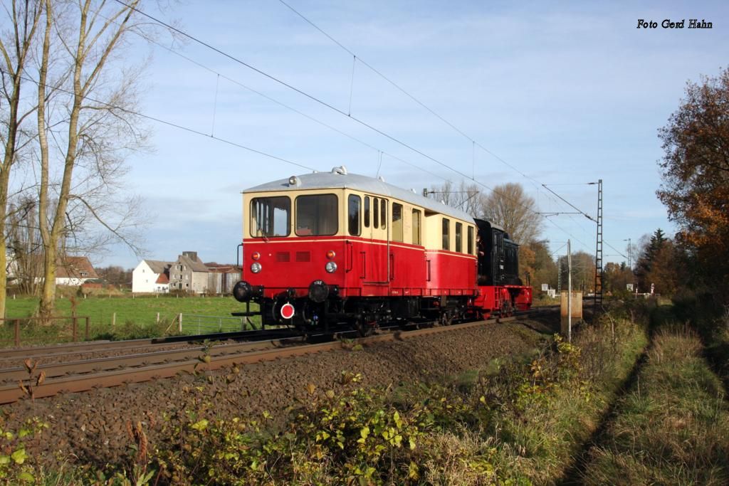 Nachschuss auf eine interessante Fuhre! Die Aufarbeitung des TWE VT 03 macht Fortschritte. Diesellok V 36412 von Eisenbahn Tradition brachte den Triebwagen am 24.11.2014 um 12.23 Uhr, hier bei der Vorbeifahrt in Lengerich - Schollbruch, zum Wiegen zur Nord West Bahn in den Hafen nach Osnabrück. Gerd Hahn