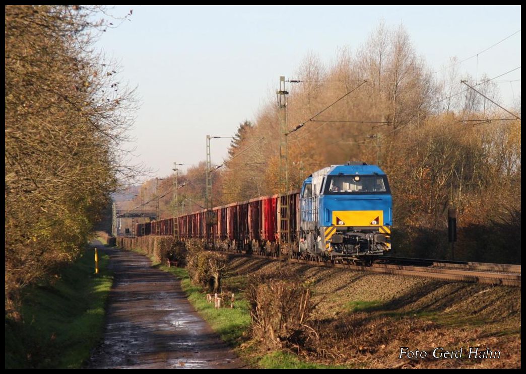 Regelmäßiger Güterverkehr durch die OHE zwischen Hasbergen und Osnabrück auf der Rollbahn. Am 17.11.2014 war Lok 272404-5 im Einsatz. Um 9.38 Uhr begegnete sie mir in Osnabrück Hellern mit einem Leerzug zum Hafen OS. Gerd Hahn