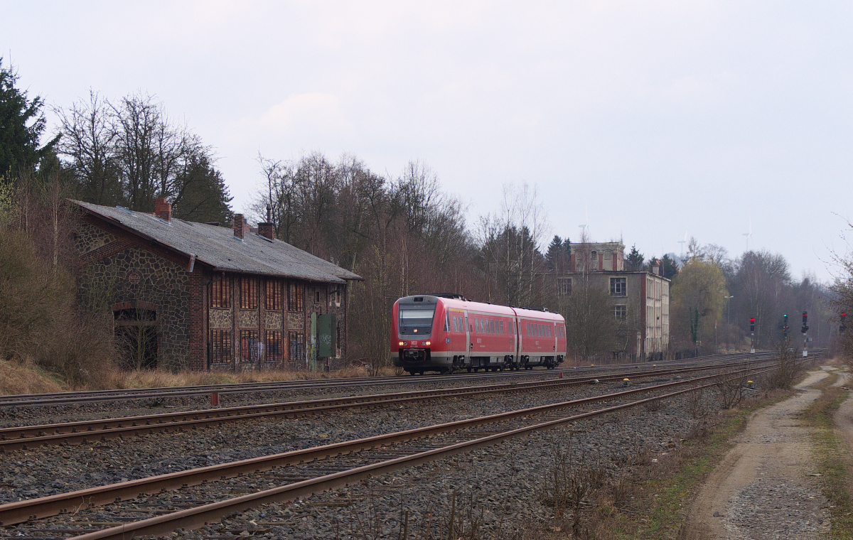 Der Triebwagen passiert gerade die ehemalige Betriebswerkstatt des längst aufgelassenen Rangierbahnhof in Oberkotzau. 17.03.2014 Erhard Pitzius