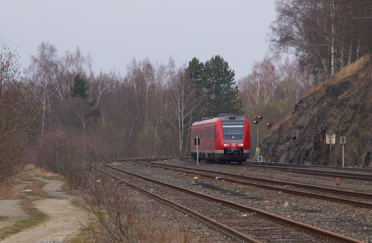 Die Relation Dresden - Nürnberg war auch 2014 noch teilweise durchgehend in der Hand der Baureihe 612. 612 094 hat vor wenigen Minuten den Hbf. von Hof verlassen und fährt am ehemaligen Rbf. von Oberkotzau vorbei. Beim Bahnhof von Oberkotzau teilt sich die Strecke aus Hof nach Selb, Marktredwitz und Neuenmarkt-Wirsberg auf. Daher ist Oberkotzau ein wichtiger Bahnknoten in Oberfranken. 17.03.2014 Bahnstrecke 5100 Bamberg - Hof. Erhard Pitzius